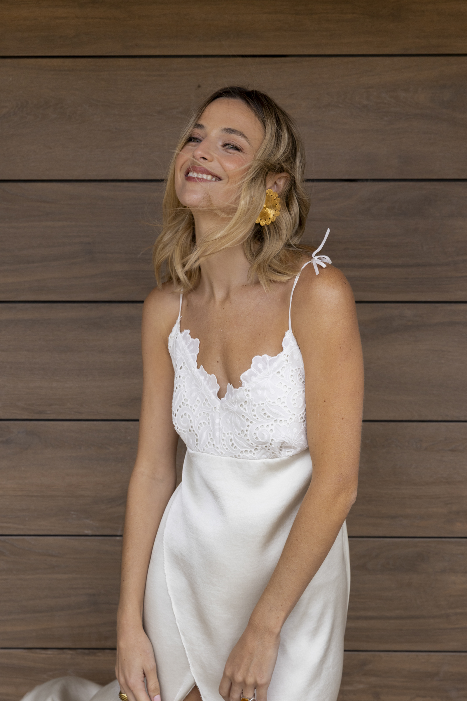 Presenta un escote en pico con delicados tirantes ajustables con lazada y una falda cruzada con abertura delantera, que aporta ligereza y movimiento.
