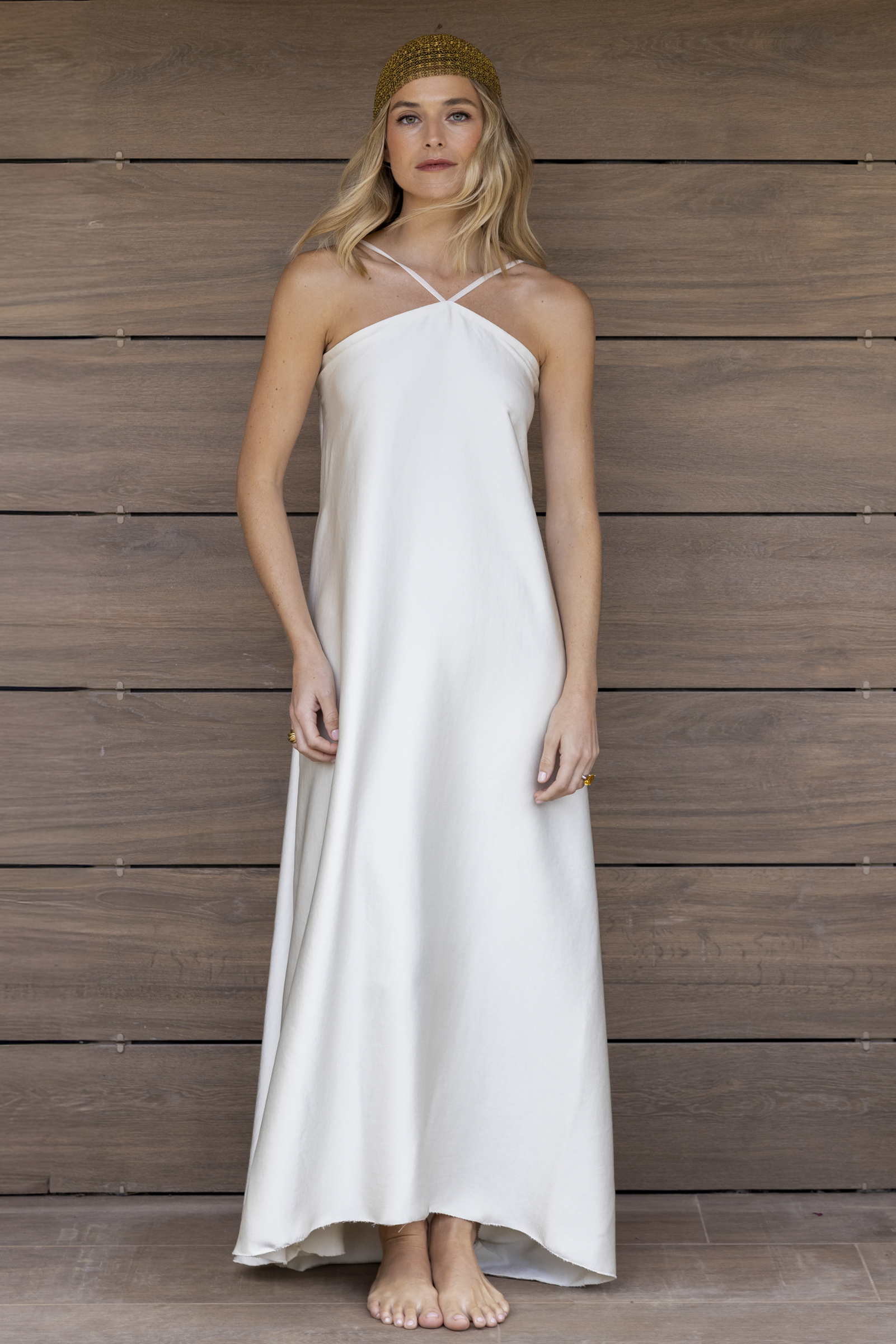Camisón confeccionado en piel de ángel color anís, con un elegante cuello halter que se ata con cintas de terciopelo en la nuca.
