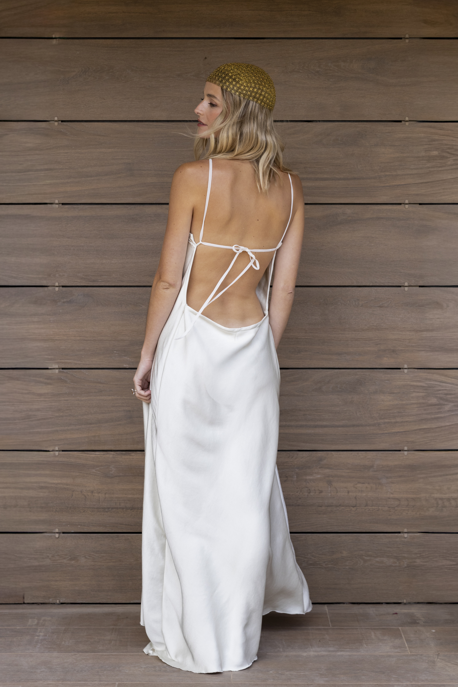 La caída fluida del tejido envuelve la silueta con delicadeza, creando una pieza ligera y elegante.