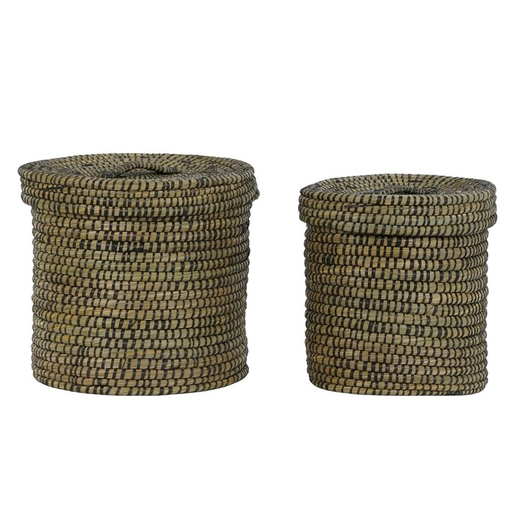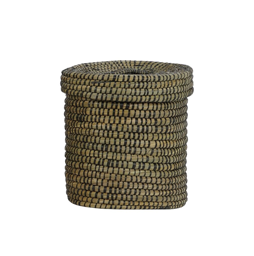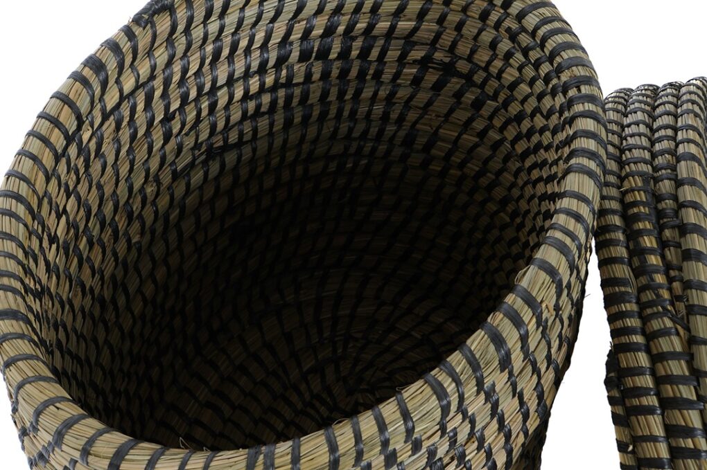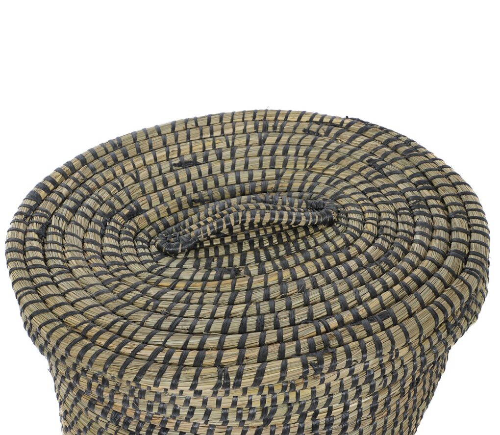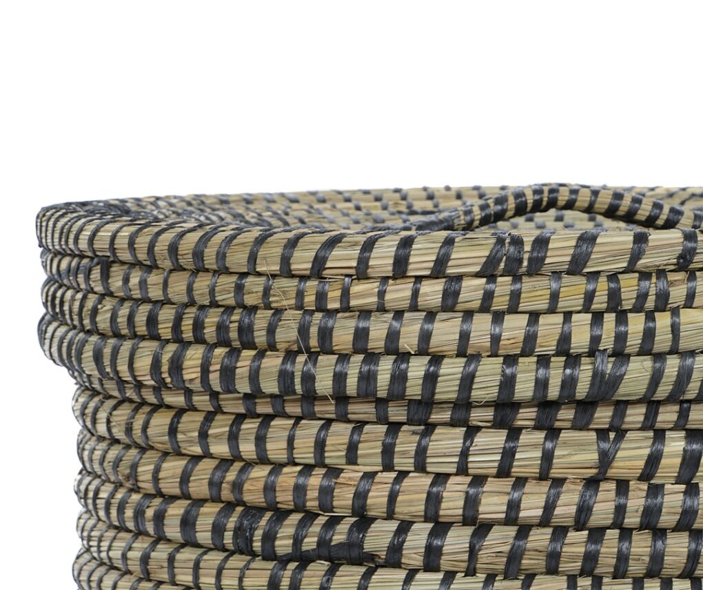 Cesta o cesto hecho de fibras naturales provenientes de plantas de pasto marino, conocidas como seagrass. Con forma ovalada y realizado en tonos natural y negro. Este cesto de estilo boho, es ideal para decorar y organizar tu hogar, además de ser resistente, sostenible y biodegradable.