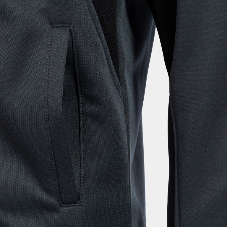 La chaqueta incorpora cierre con cremallera completa y pulsor protegido por una pieza de textil, así se evita que roce con el cuello. Igualmente, cuenta con cuello alto para dar calor a la zona y bolsillos para guardar pequeños objetos. El rib del bajo y los puños consiguen un ajuste más cómodo con el fin de no dejar escapar el calor corporal sin limitar la movilidad. En cuanto al diseño, posee líneas a contraste en los laterales y mangas que estilizan la sudadera.