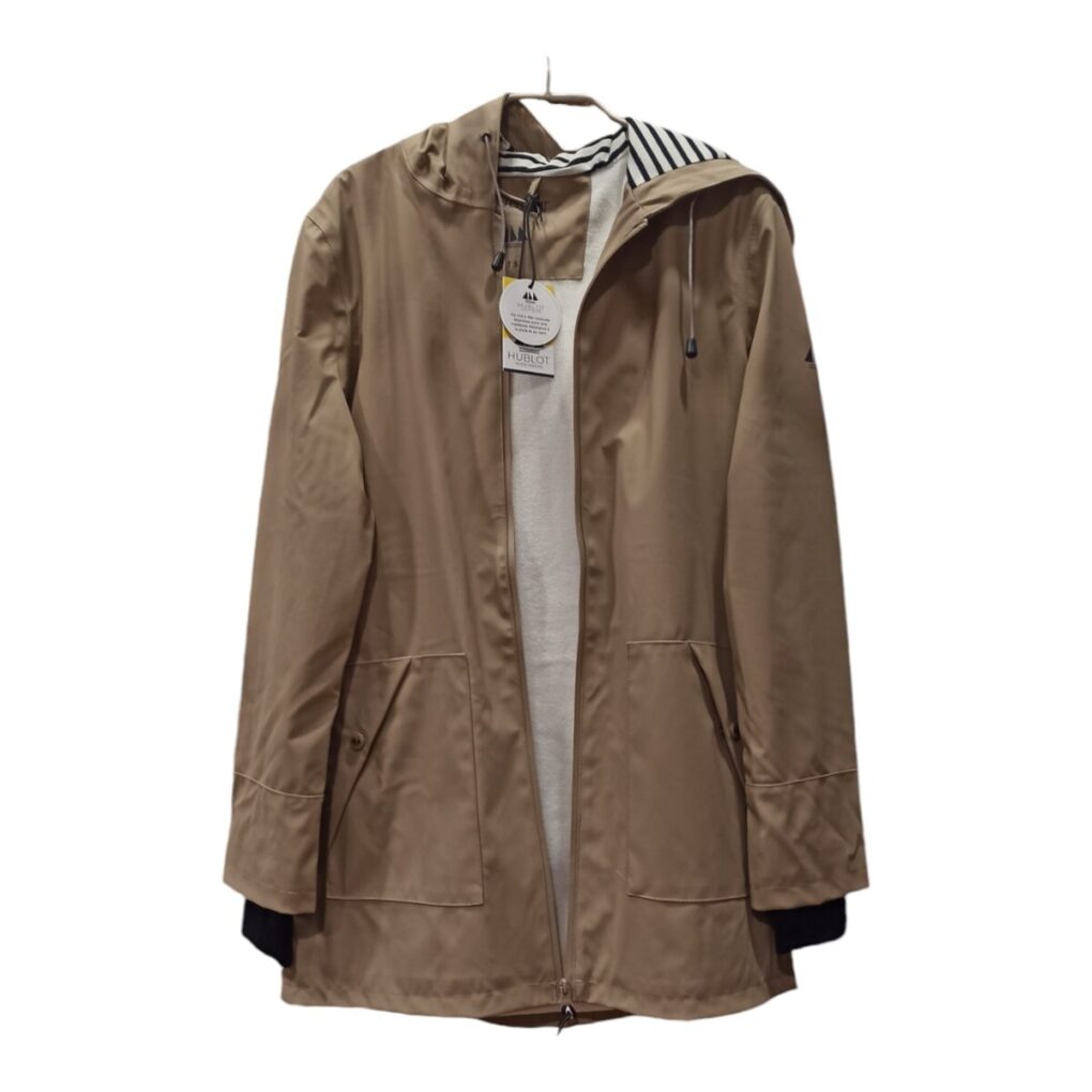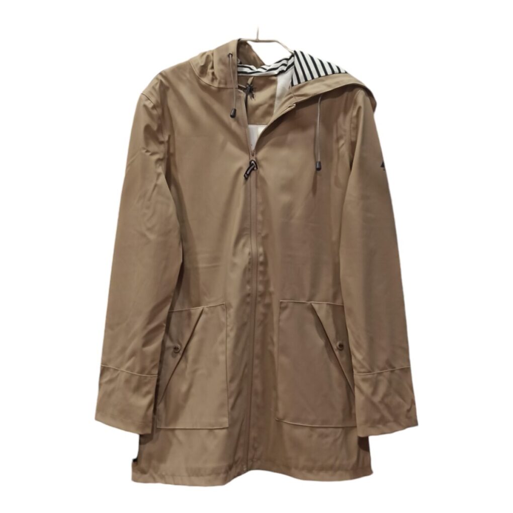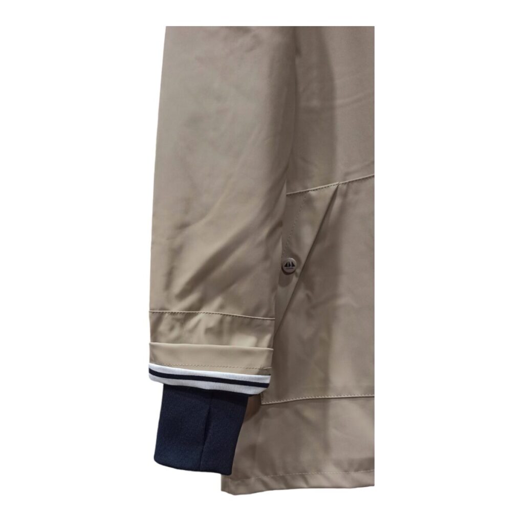 Chubasquero impermeable de color marrón claro con forro en borreguito blanco, capucha con forro en tela de rayas azul marino y blanco, bolsillos laterales y cierre con cremallera. Tiene puños elásticos en azul marino, con un agujero para meter el dedo gordo de la mano y similar un guante o mitón. Es ideal para protegerse del viento frío y de la humedad. Además de ser ligero y cálido. Su composición es 100% poliuretano, forro 100% poliéster.
