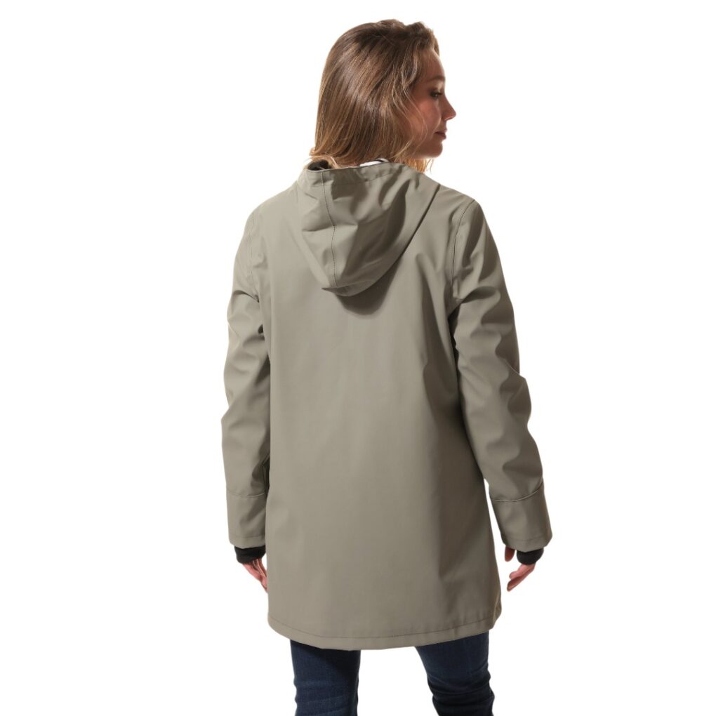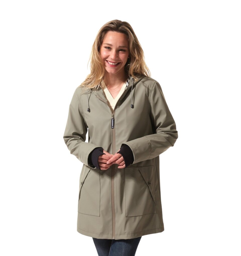 Chubasquero impermeable de color verde con forro en borreguito blanco, capucha con forro en tela de rayas azul marino y blanco, bolsillos laterales y cierre con cremallera. Tiene puños elásticos en azul marino, con un agujero para meter el dedo gordo de la mano y similar un guante o mitón. Es ideal para protegerse del viento frío y de la humedad. Además de ser ligero y cálido. Su composición es 100% poliuretano, forro 100% poliéster.