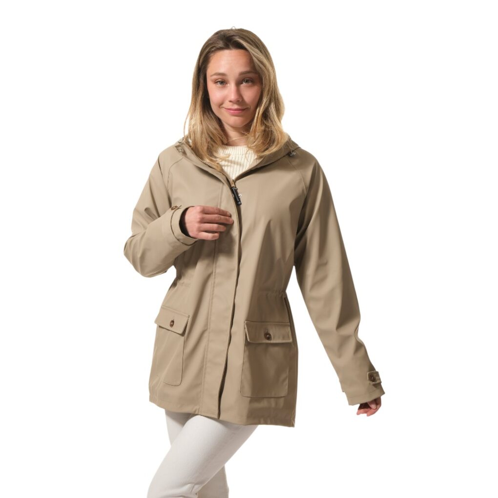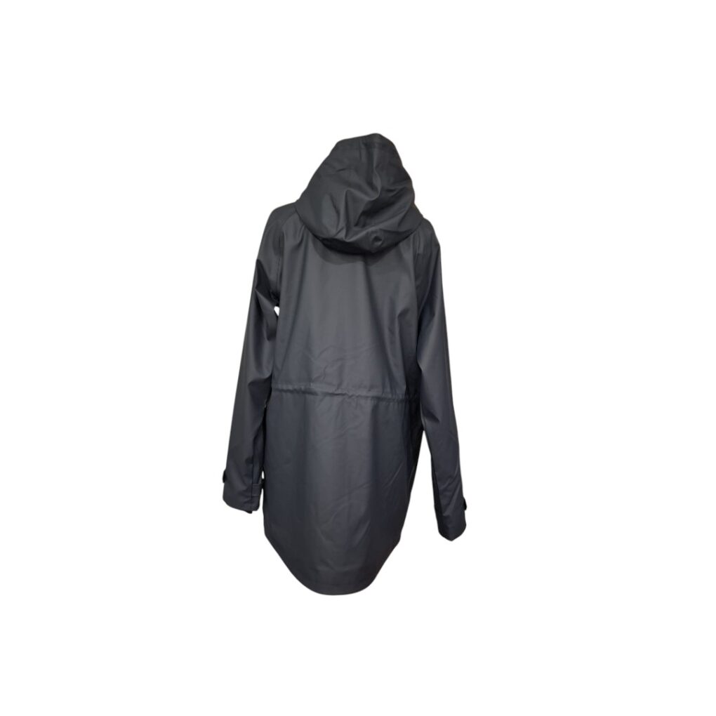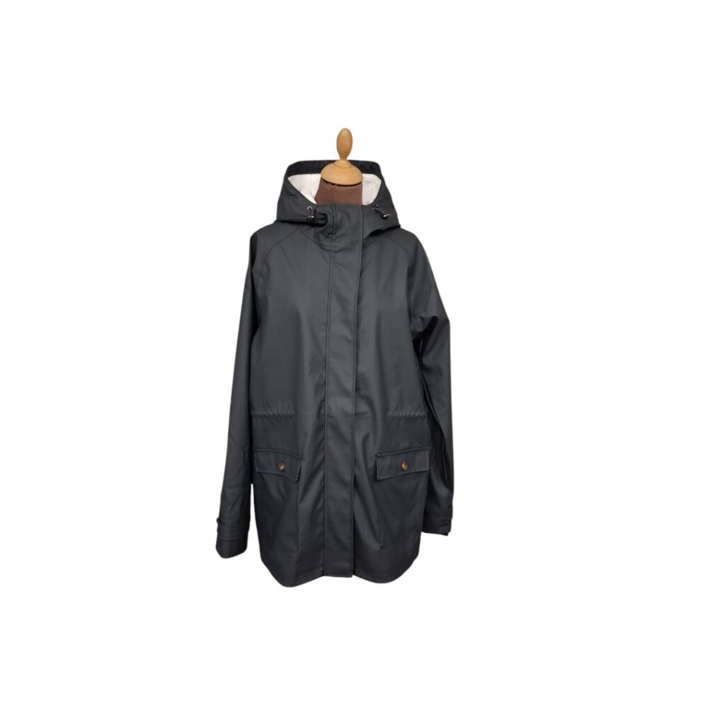 Chubasquero impermeable, de color azul marino con forro polar en color blanco. C0n capucha, bolsillos laterales, cierre con cremallera y cordón interior para ajustar en la cintura. Es ideal para protegerse del viento frío y de la humedad. Además de ser ligero y cálido. Su composición es 100% poliuretano, forro 100% poliéster.