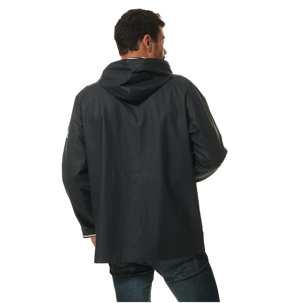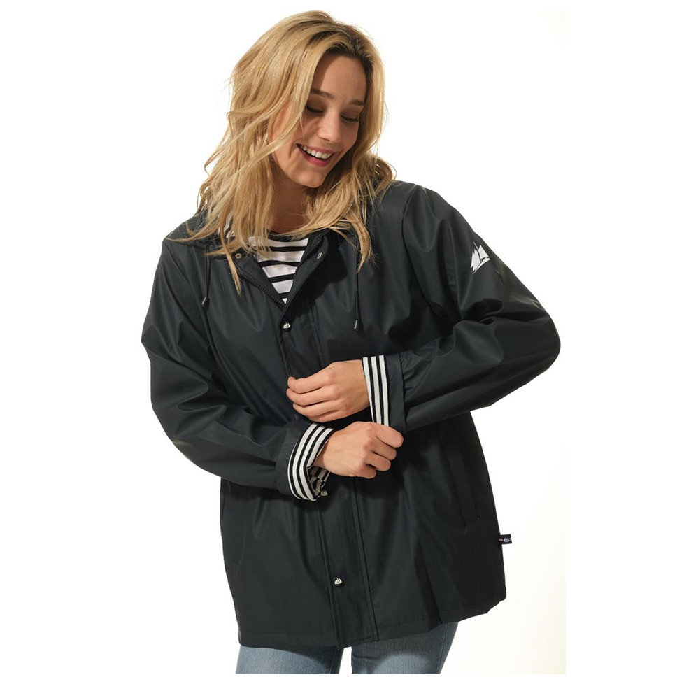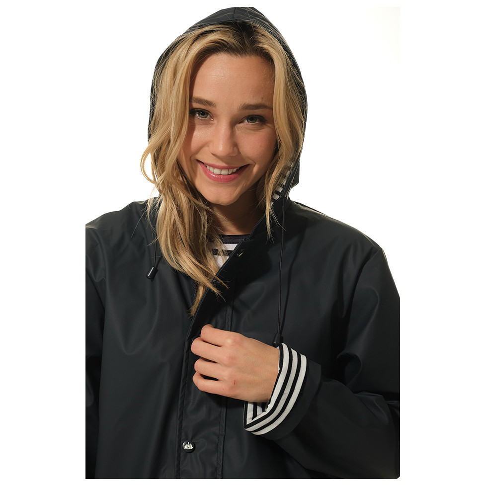 Chubasquero impermeable, de color azul marino con forro polar en color arena y forro de rayas azul marino y blanco en la parte inferior de las mangas y la capucha. Con bolsillos laterales y doble cierre frontal con cremallera y corchetes. Es ideal para protegerse del viento frío y de la humedad. Además de ser ligero y cálido. Su composición es 100% poliuretano, forro 100% poliéster.