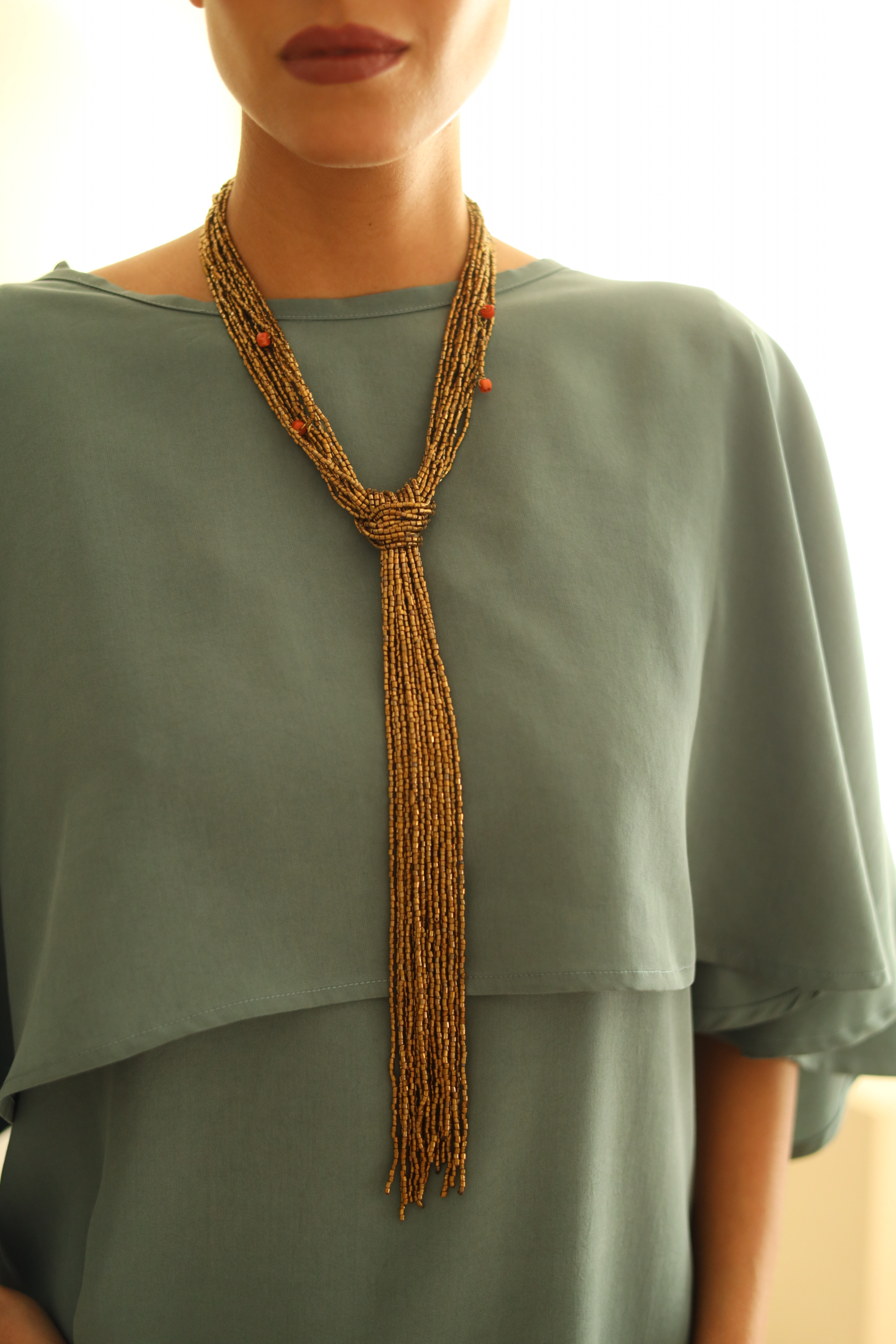 Puedes combinarlo con nuestro vestido Begur, tanto en verde como en mostaza. Y lograr un look armonioso y muy chic. En su versión verde, el collar suma contraste y profundidad. Mientras que en la opción mostaza resalta los tonos cálidos y genera una combinación fresca y muy sofisticada.