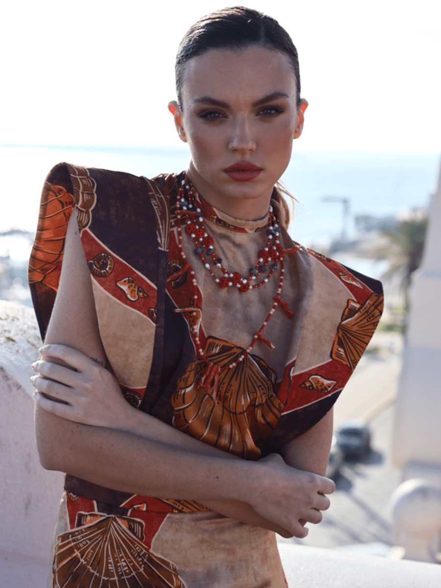 Collar con ramas y bolitas de coral rojo, detalle de perlas y amatistas. Cierre en cadena dorada con alargadera.
