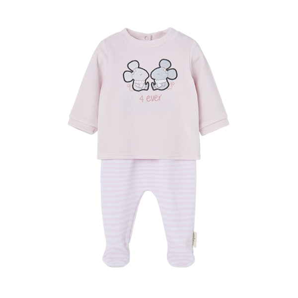 Conjunto de dos piezas de niña compuesto por una camiseta de manga larga con cierre de botones trasero y por una polaina con cinturilla elástica. Estampado de ratitas.