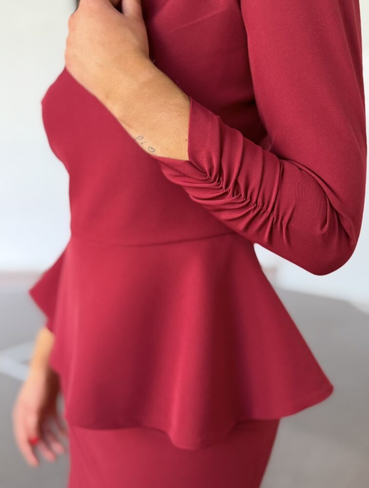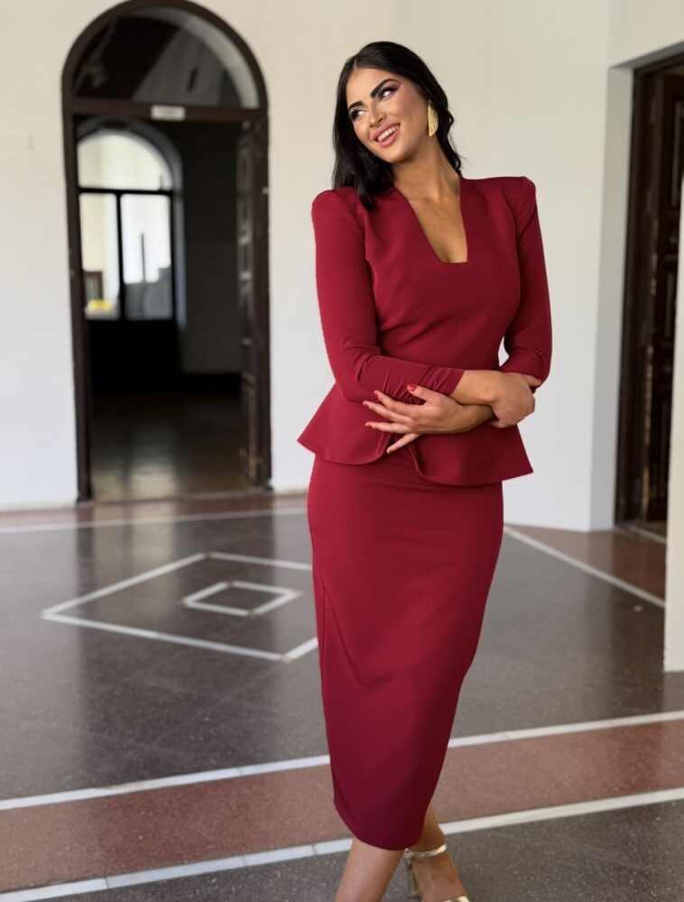 Conjunto de falda y blusa de color burdeos forrado al tono. El toque de distinción lo marca el peplum de la blusa y la espalda tan protagonista. La falda es de tiro alto con raja pronunciada trasera.