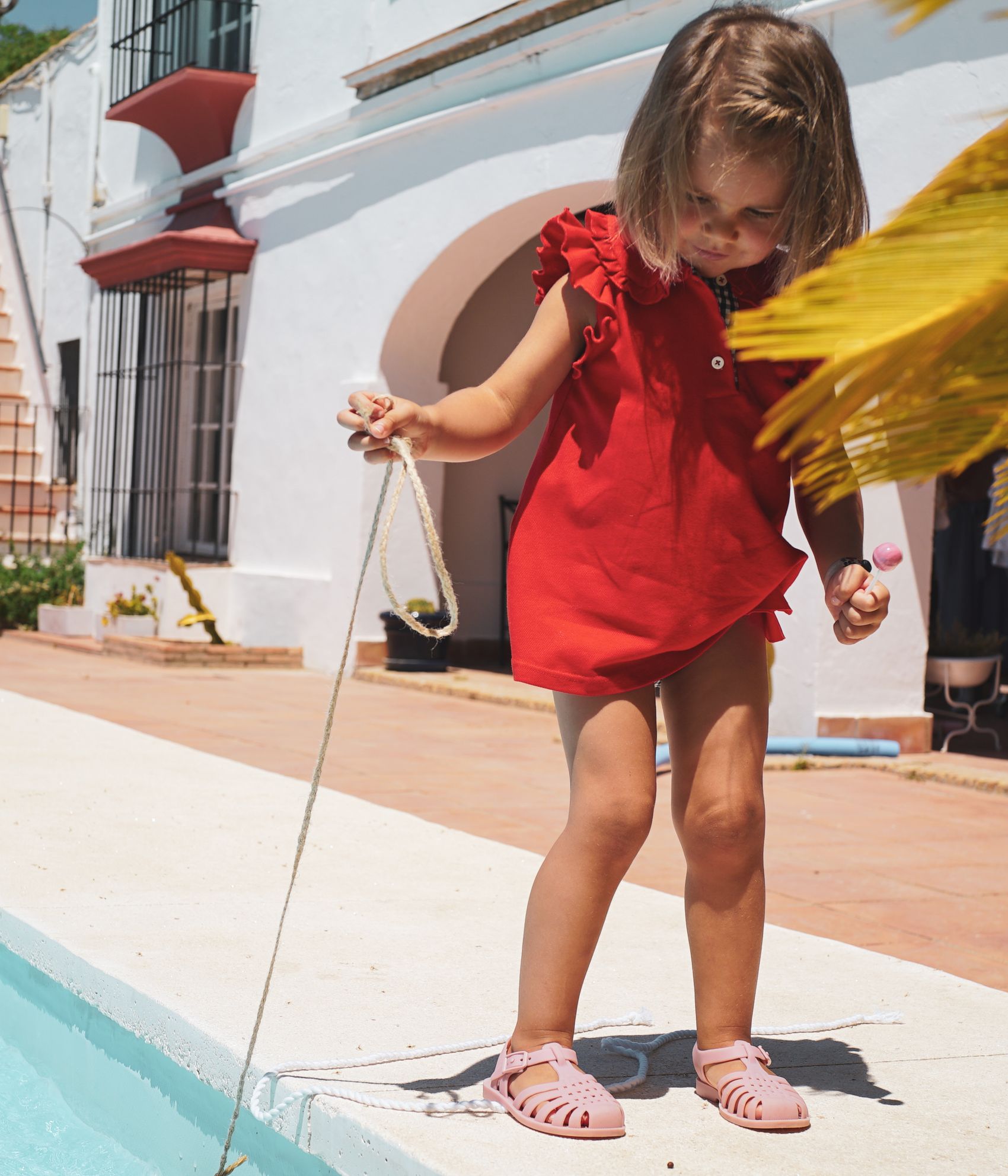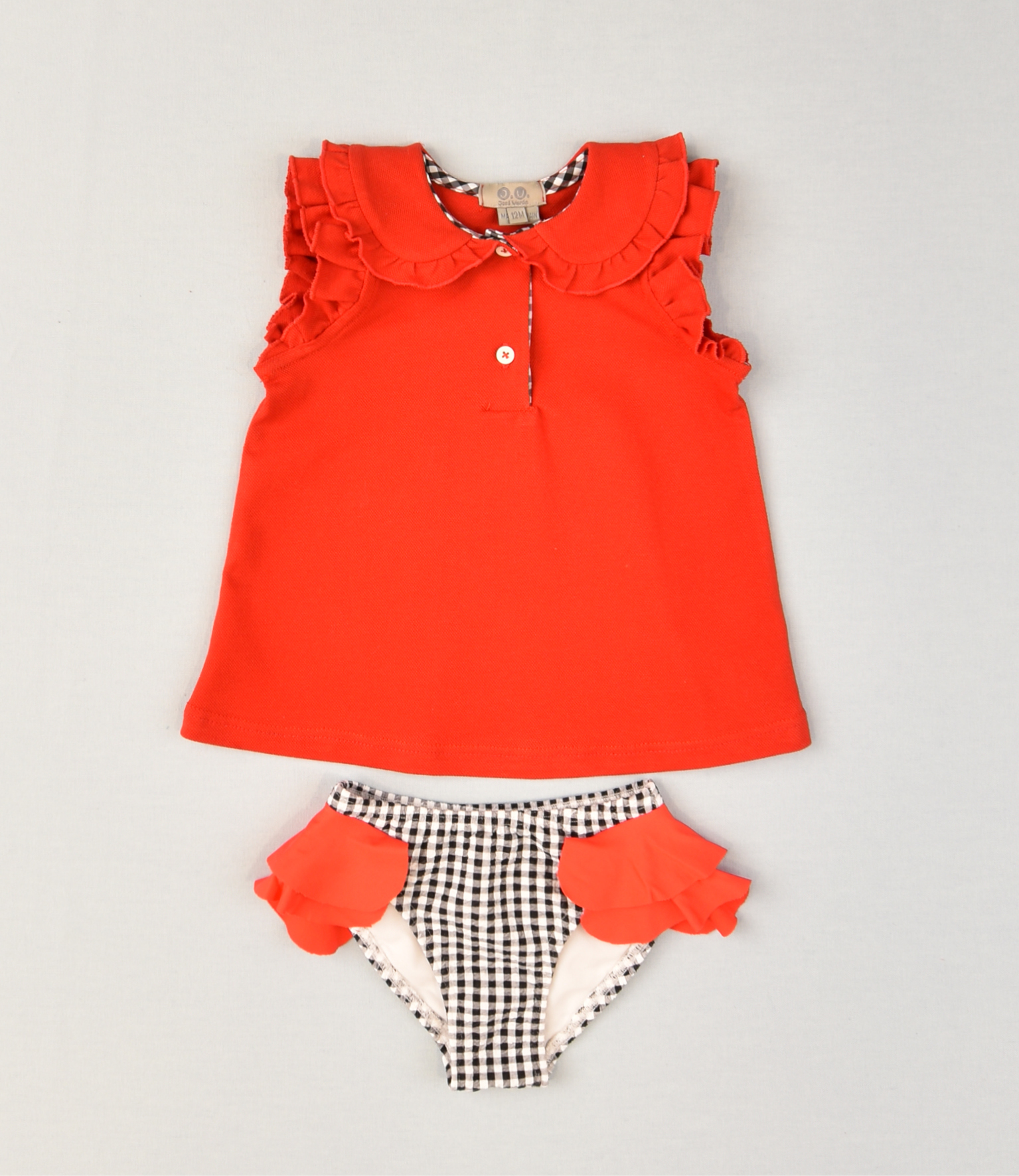 Vestido de algodón color rojo, con braguita de cuadros color negro.
