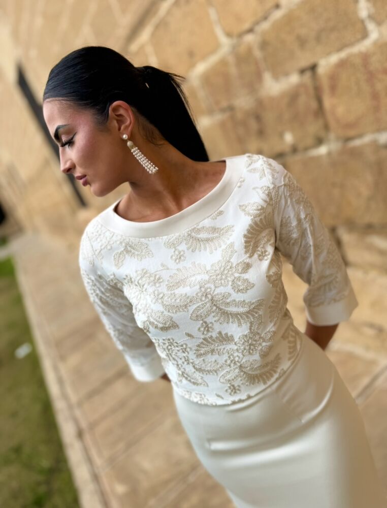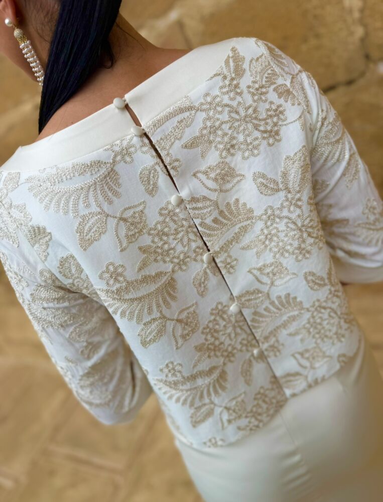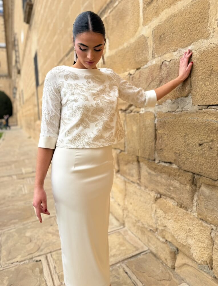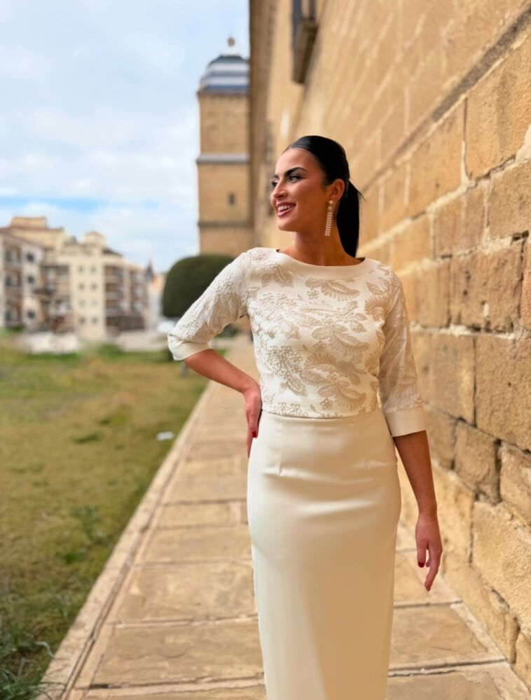 Conjunto de blusa y falda. El toque de distinción lo marca la blusa que lleva un tejido brocado en tono dorado y botonadura al tono en la parte trasera. La falda es de tiro alto en tejido satén forrada al tono. Un conjunto espectacular que llega hasta la talla 50.