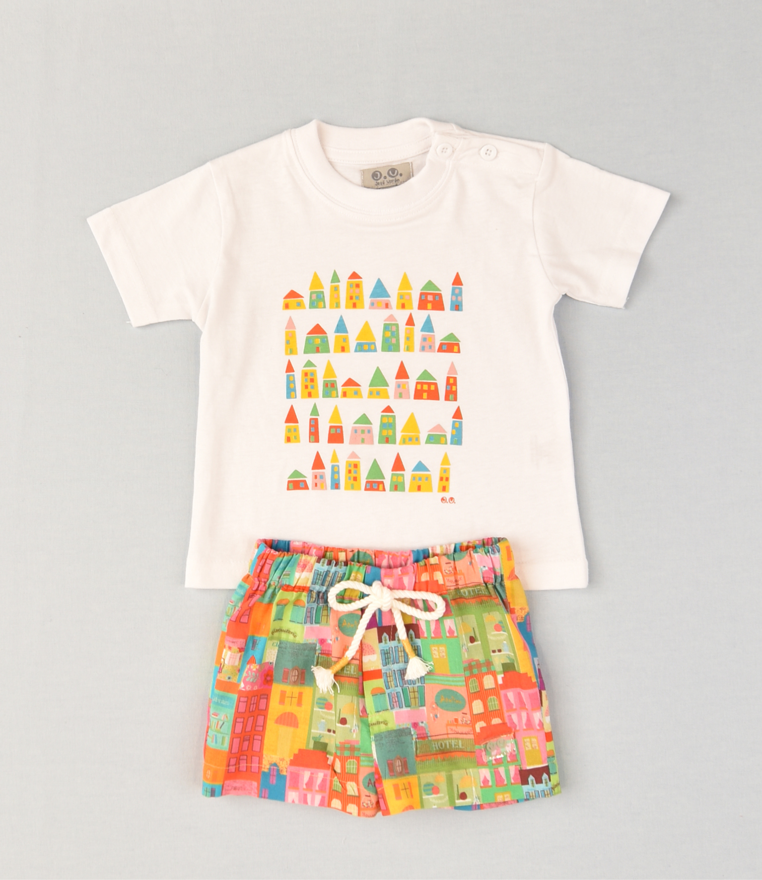 Conjunto de niño compuesto por camiseta blanca con dibujo de casitas y pantalón corto a juego con el mismo estampado.