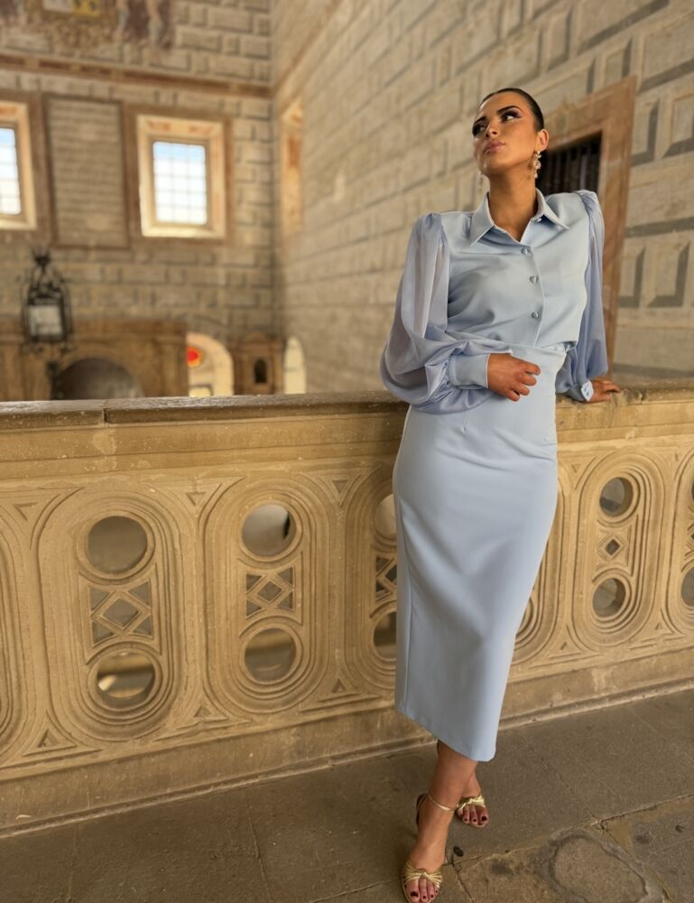 Conjunto de dos piezas compuesto por una blusa y una falda en tejido crepe. El toque de distinción lo marca las mangas abullonadas en gasa de la blusa y la botonadura central forrada al tono. La falda es de tiro alto con raja trasera. Un conjunto espectacular para arrasar como invitada perfecta.
