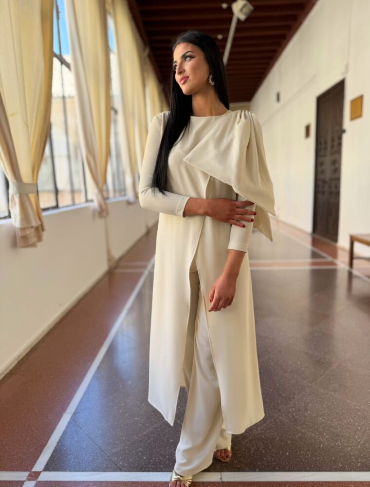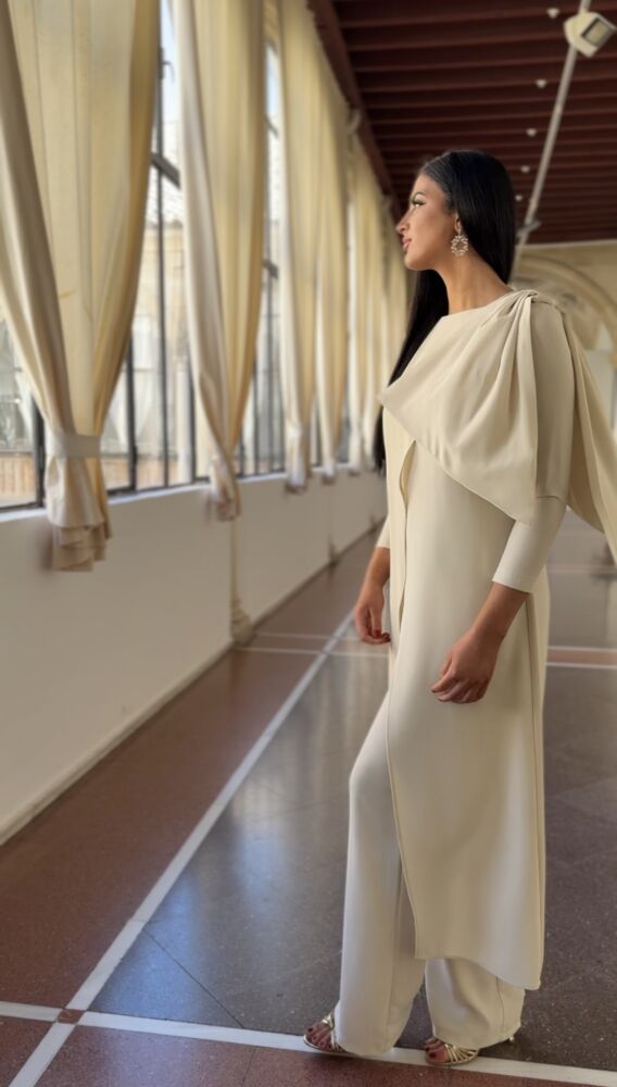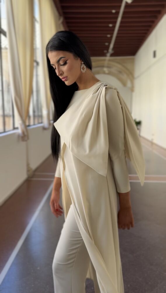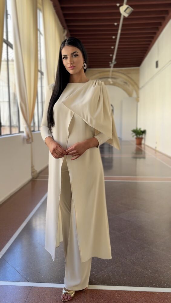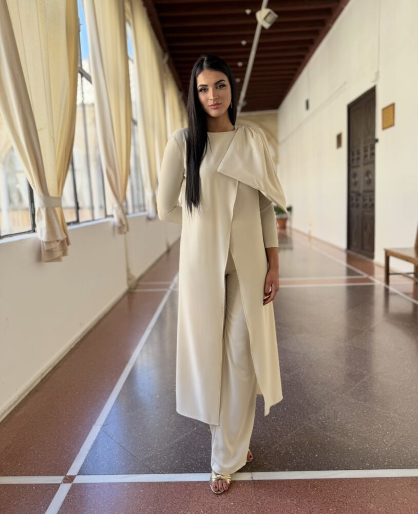 Conjunto de dos piezas formado por blusón largo y pantalón. El pantalón está fabricado en tejido crepe bioelástico y es de tiro alto. El blusón está fabricado en crepe fluido y el toque de distinción lo marca la abertura frontal y la lazada al hombro.