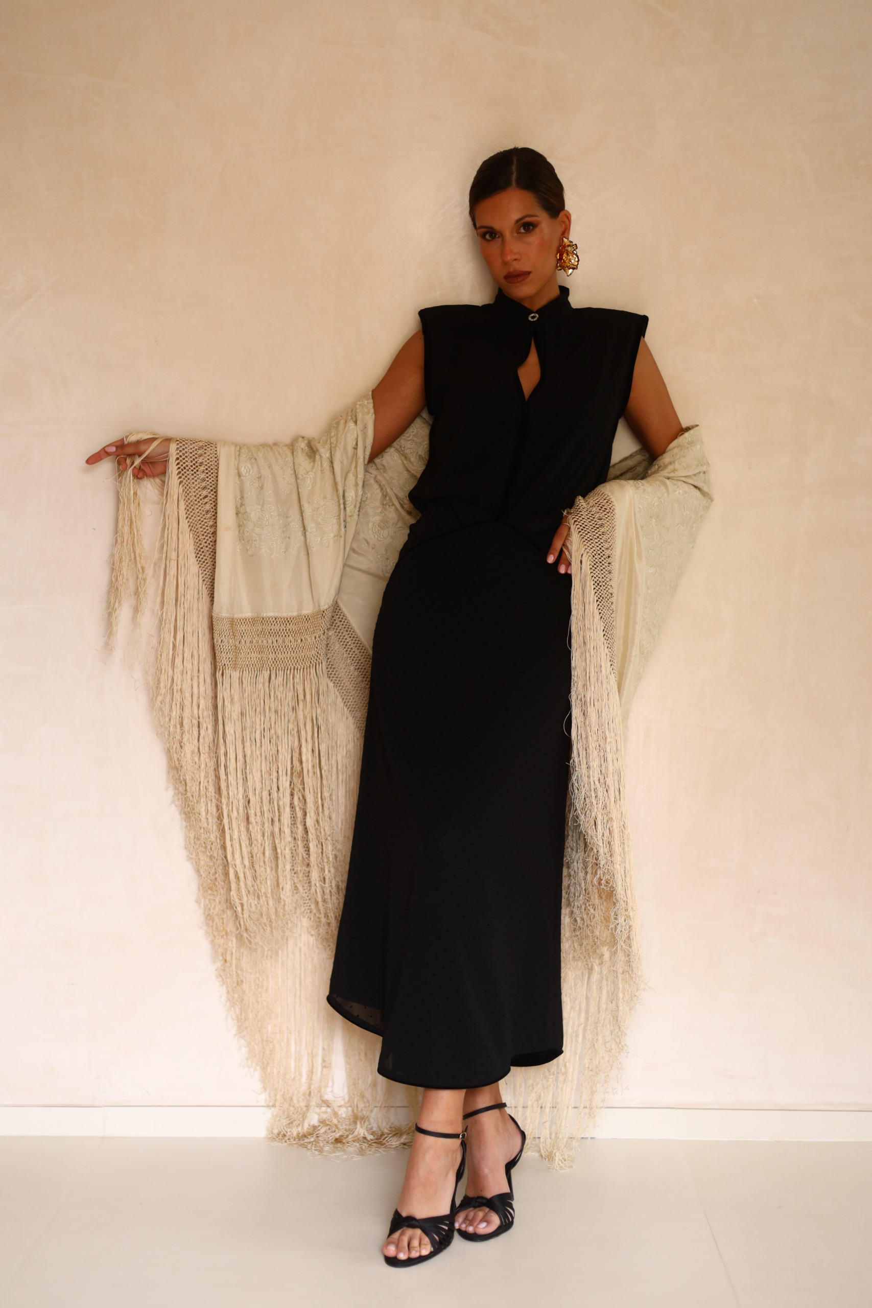 Para lograr un conjunto equilibrado y con una fuerte identidad estética, se recomienda combinar esta falda con la Blusa Abril, diseñada para complementar los mismos tonos y texturas. El resultado es un total look que combina romanticismo moderno con toques de sofisticación atemporal.
