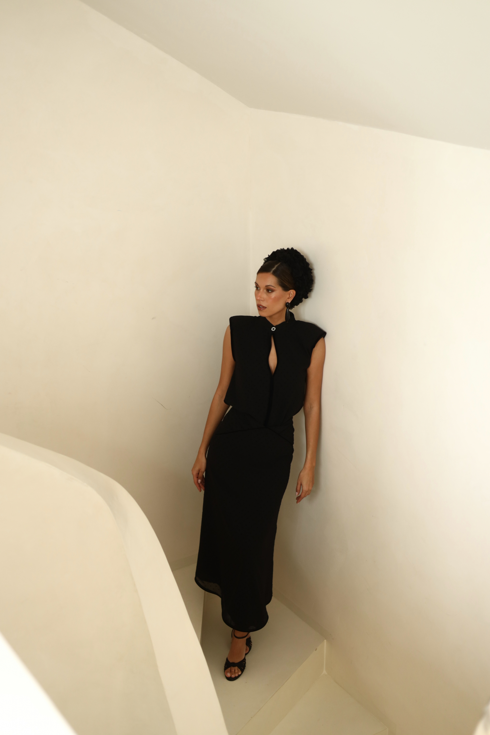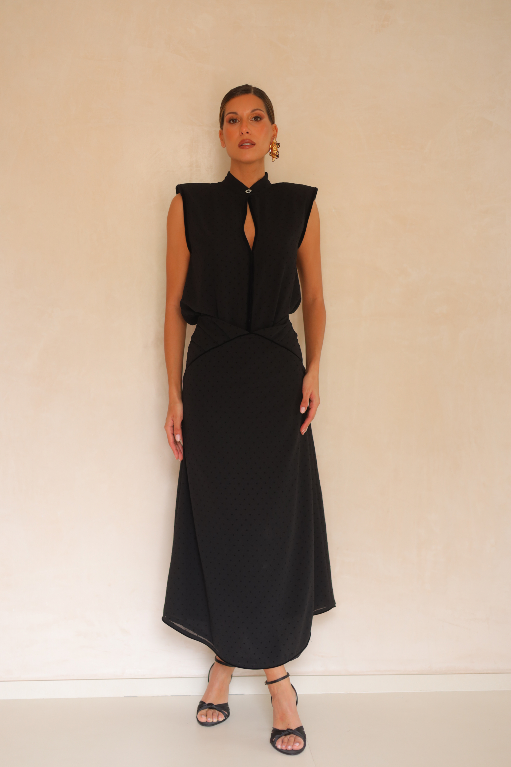 Falda midi confeccionada en delicada gasa negra, que destaca por su caída fluida y su textura vaporosa. Esta prenda presenta un sutil pero elegante estampado de lunares en terciopelo negro. Qe le aporta profundidad visual y una sofisticación discreta. Perfecta para quienes buscan piezas con carácter sin recurrir al exceso. El juego de texturas entre la gasa ligera y el terciopelo aterciopelado eleva la falda a una categoría especial dentro del armario. Convirtiéndola en una opción ideal tanto para eventos diurnos como para ocasiones más formales.