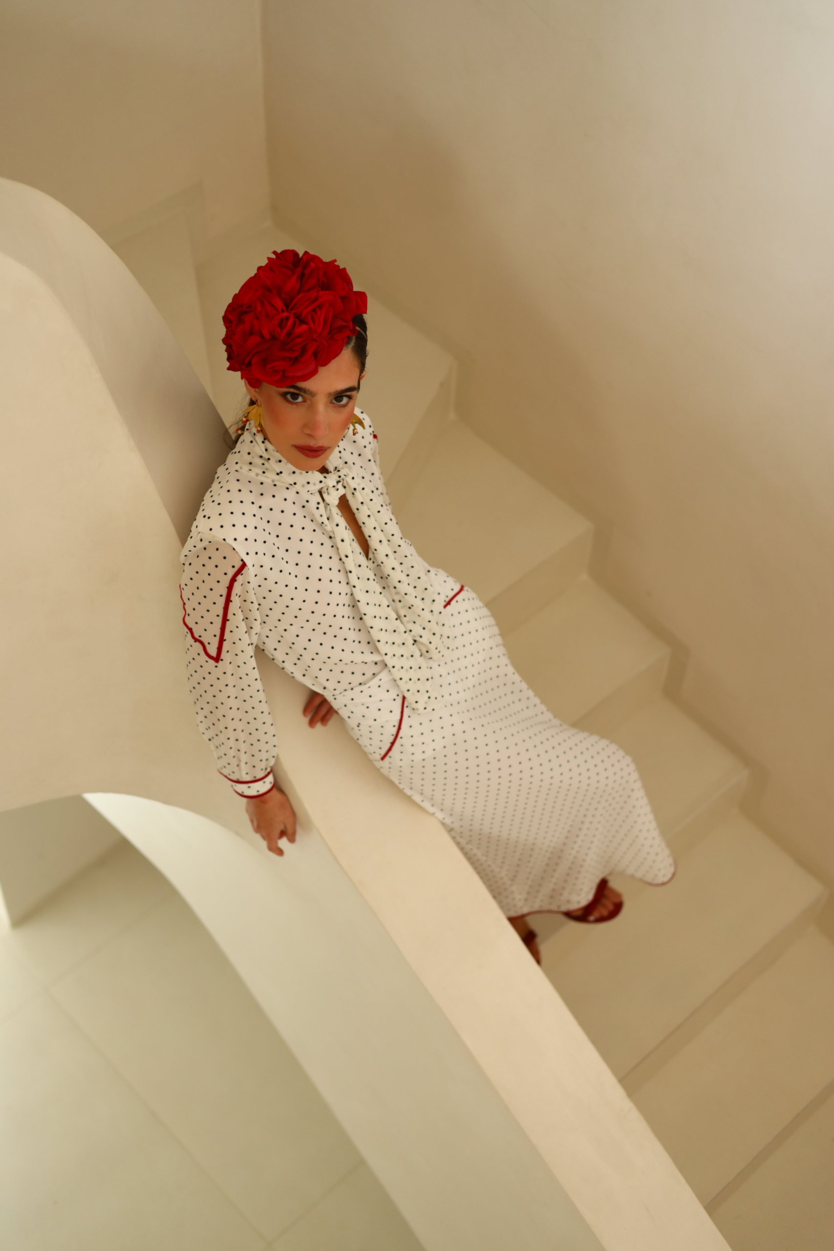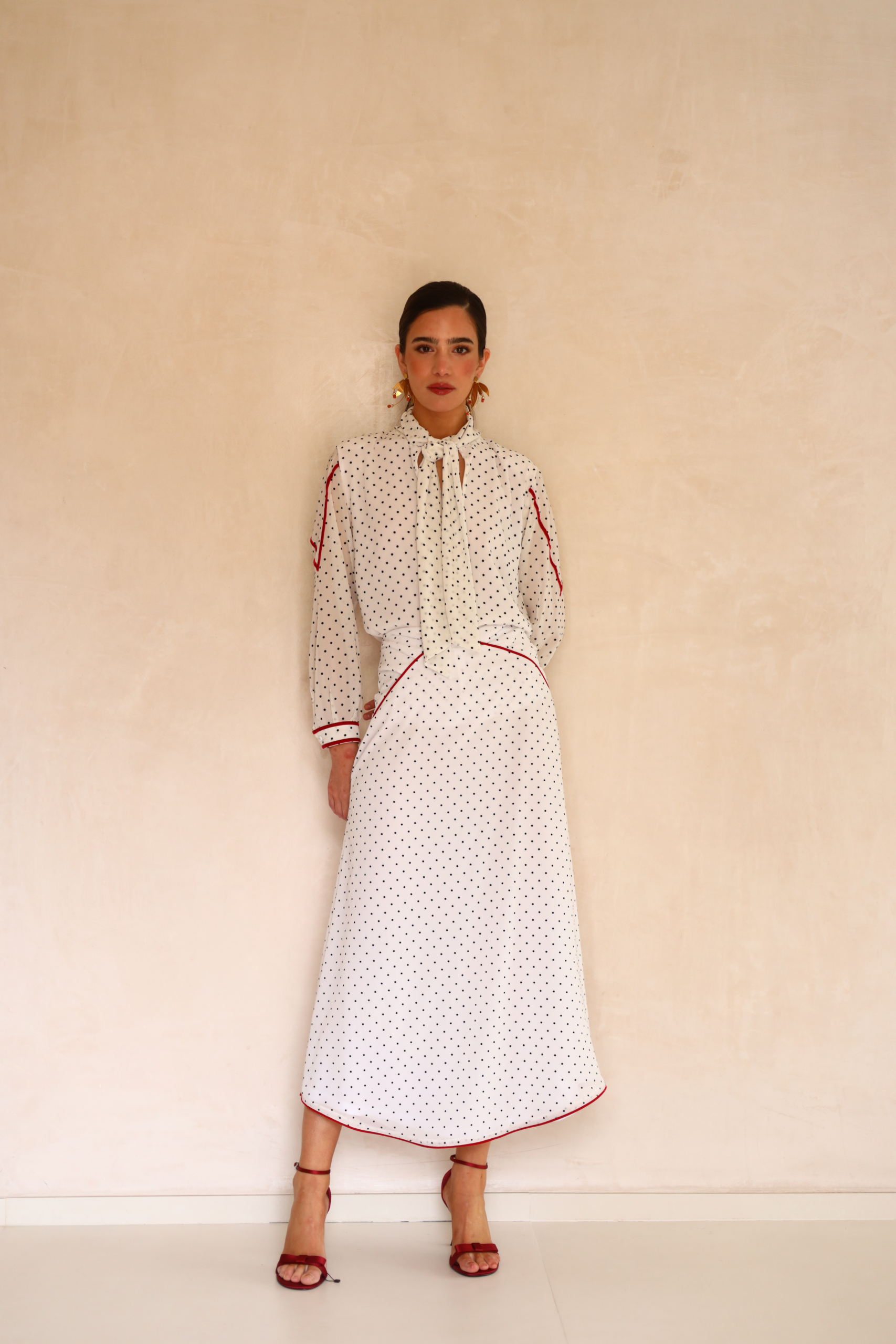 Falda confeccionada en un exquisito tejido de gasa blanca, que se distingue por su ligereza y movimiento etéreo, ideal para aportar un aire romántico y femenino a cualquier estilismo. El diseño incorpora un delicado estampado de lunares en terciopelo negro que contrasta de manera sutil. Pero decidida con el fondo claro, logrando una estética atemporal y elegante que reinterpreta el clásico binomio blanco y negro con un enfoque moderno y lleno de personalidad.