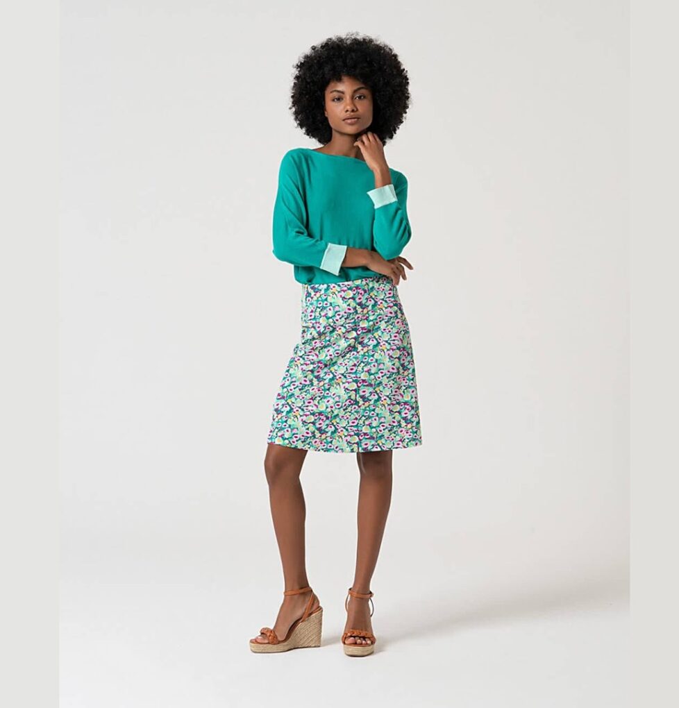 Falda corta de viscosa, con vuelo, sin cierres y con estampado de flores en tonos verde agua, rosa, burdeos y amarillo. Su tejido es elástico debido a su composición, 88% viscosa, 9% poliéster y 3% elastano.