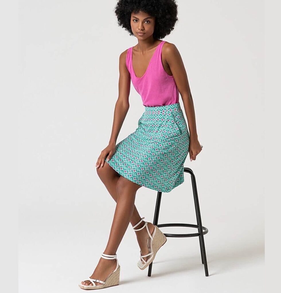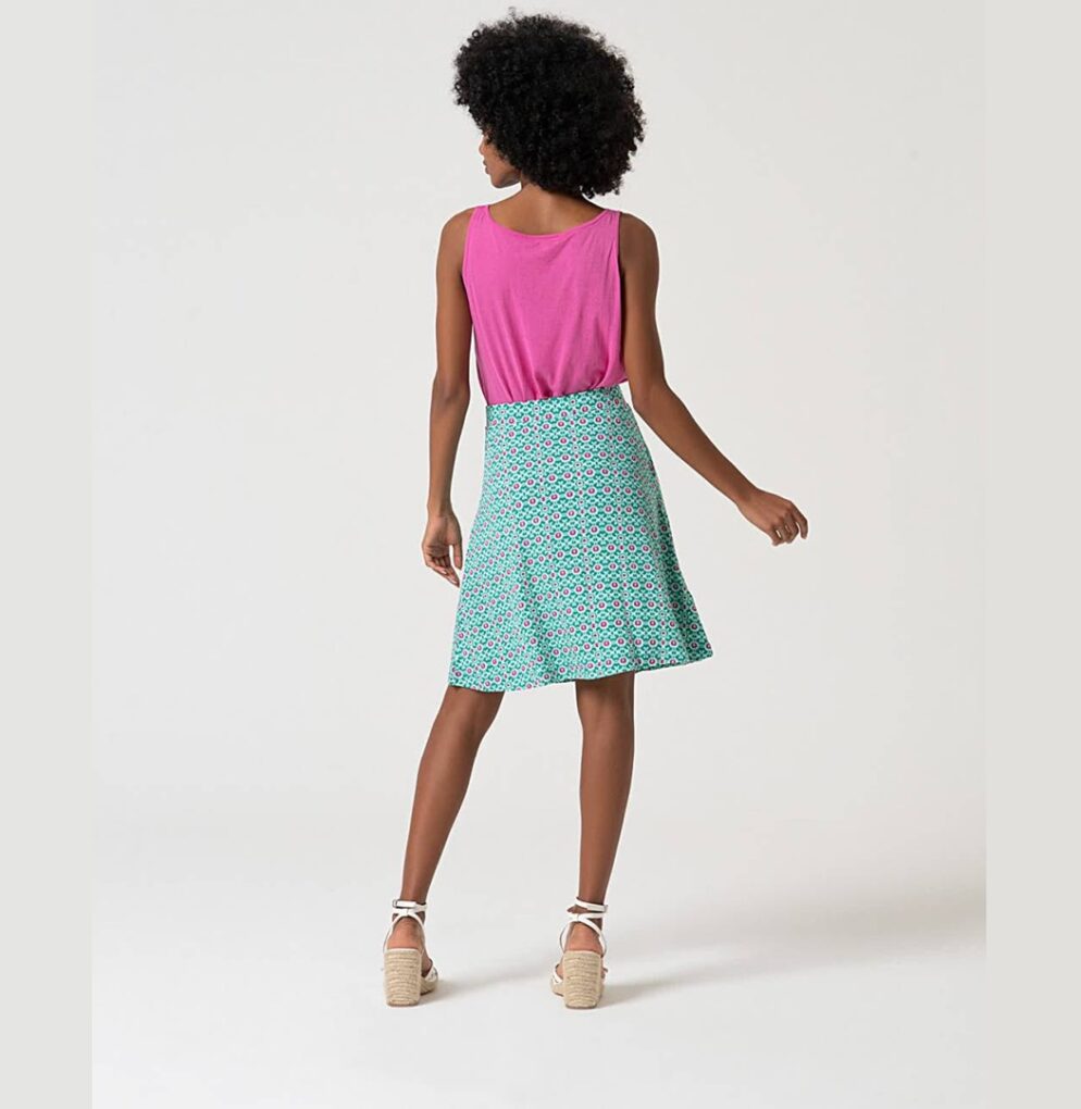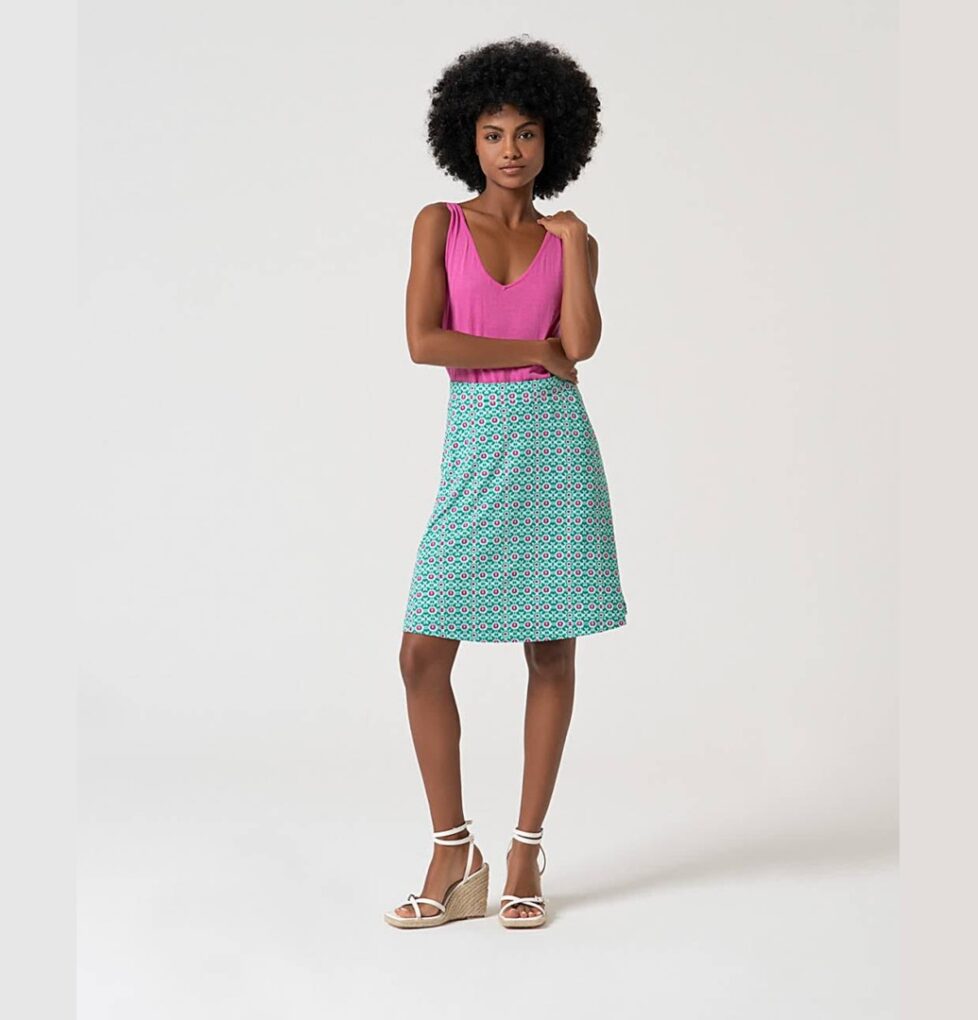 Falda corta de viscosa, con vuelo, sin cierres y con estampado en tonos turquesa y rosa. Su tejido es suave y elástico debido a su composición, 96% viscosa y 4% elastano.