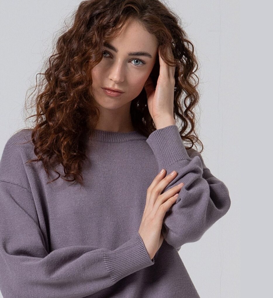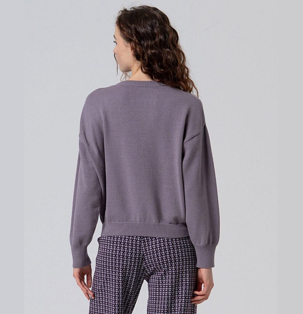 Jersey de punto en color gris enpolvado, con manga larga abullonada y cuello redondo. Composición 50% viscosa y 28% poliéster y 22% nylon.