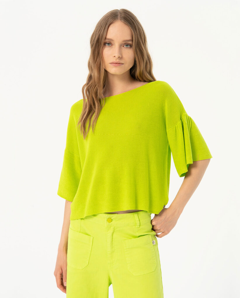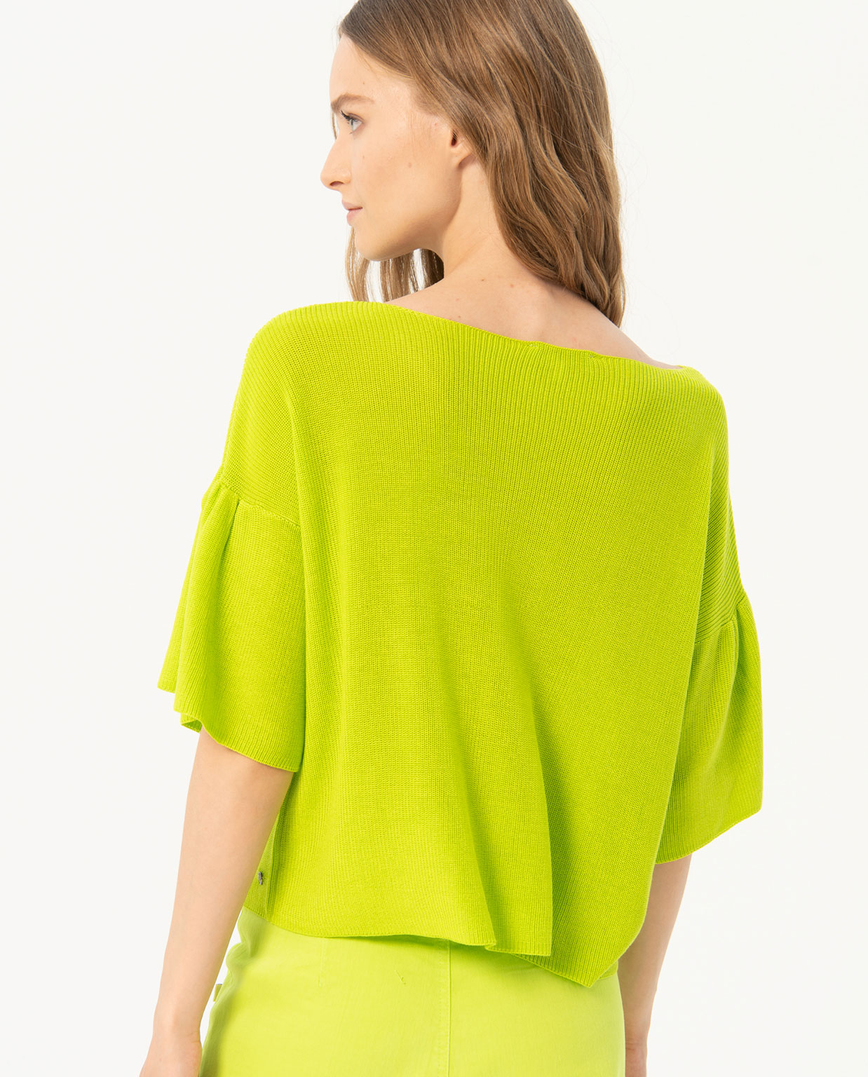 Jersey de punto fino, con escote barca y manga corta avolantada. En color verde ácido. Composición 100% liocel