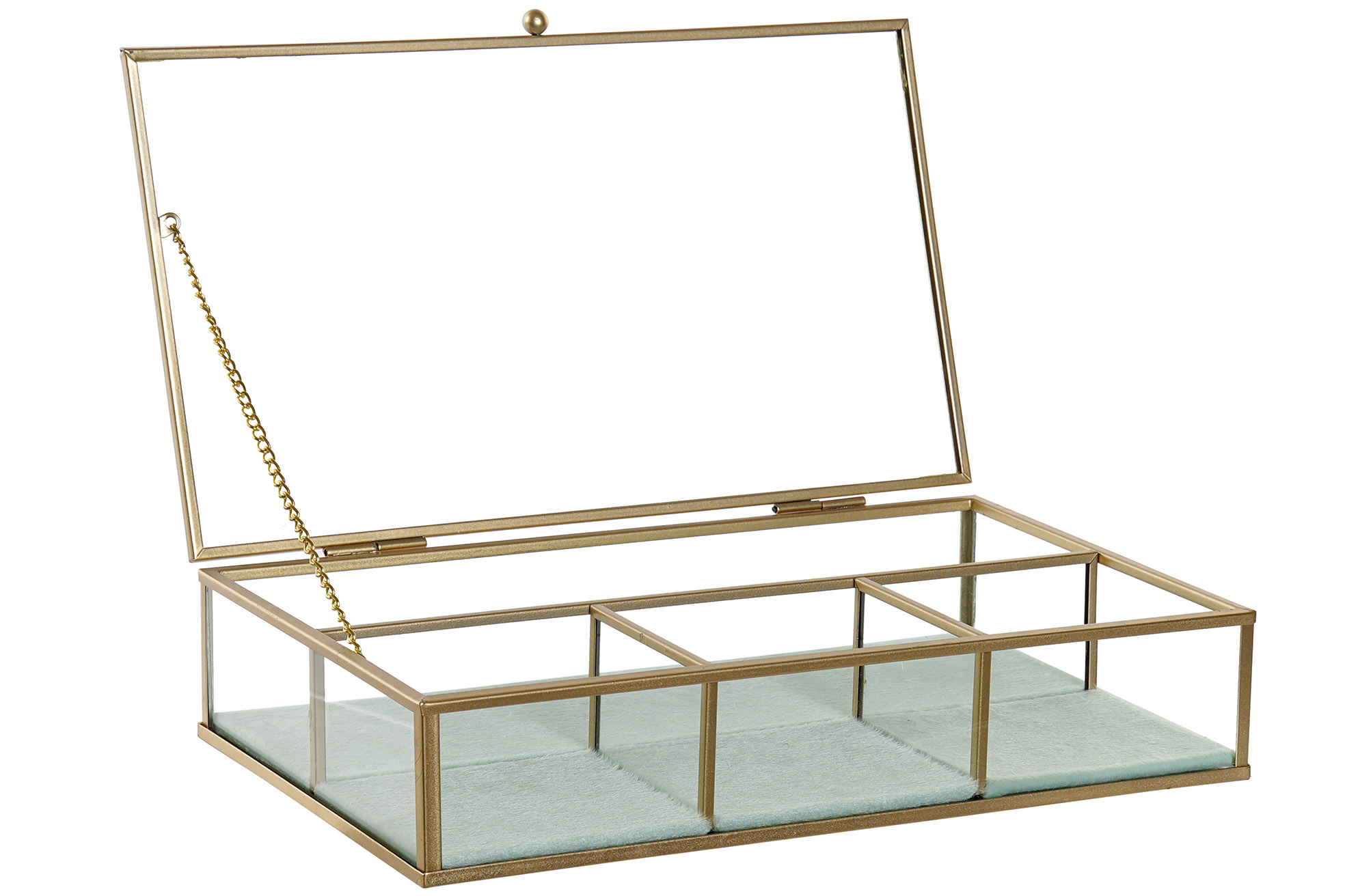 Joyero de cristal y metal dorado. Con departamentos para ordenar las joyas, la parte inferior interna está forrada con terciopelo beige.