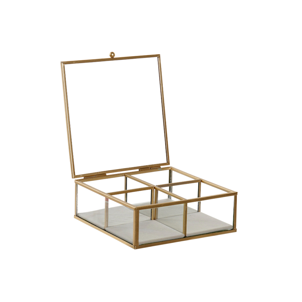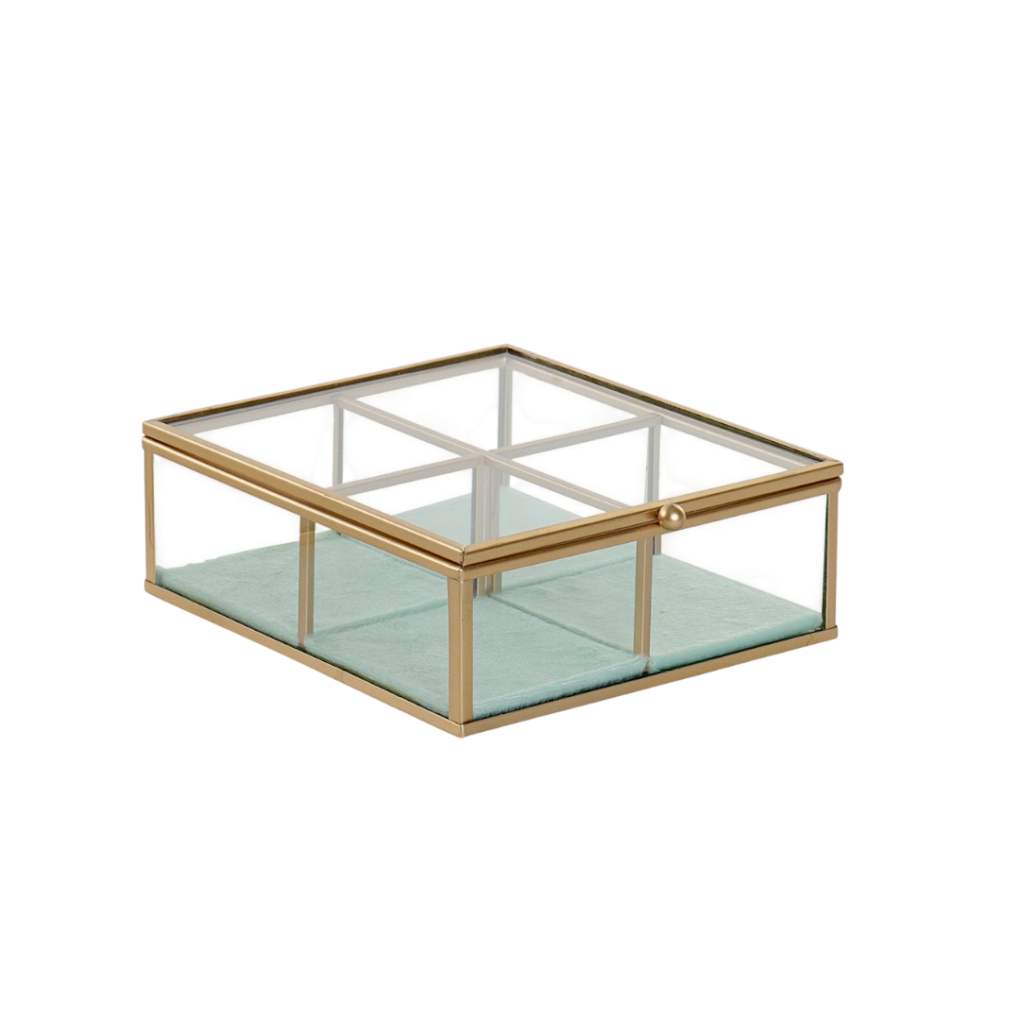 Joyero de cristal y metal dorado. Con departamentos para ordenar las joyas, la parte inferior interna está forrada con terciopelo verde agua.