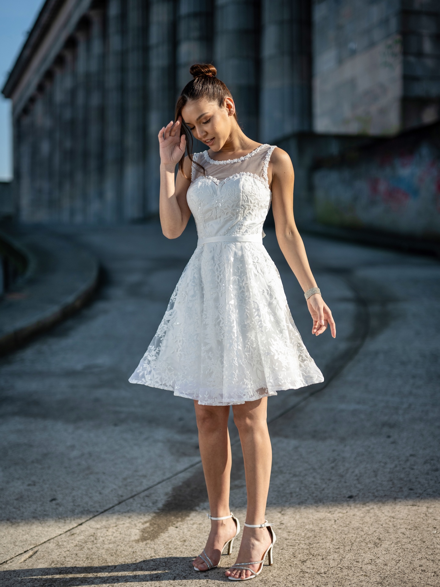 Vestido sin mangas, evase a la rodilla de tull bordado y parte superior con transparencias. Detalle de cintura marcada con un lazo, escote corazón profundo con tazas que arman la zona del busto, espalda que se adapta a varios talles ya que tiene un sector de la misma con hilo elástico, cuello y sisas con apliques de flores.