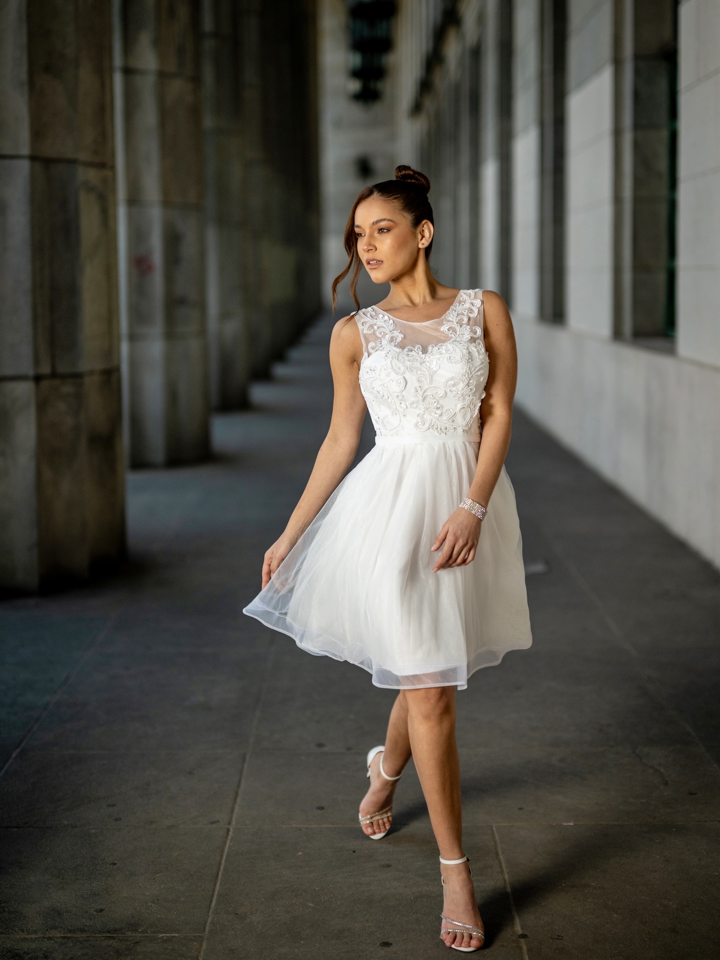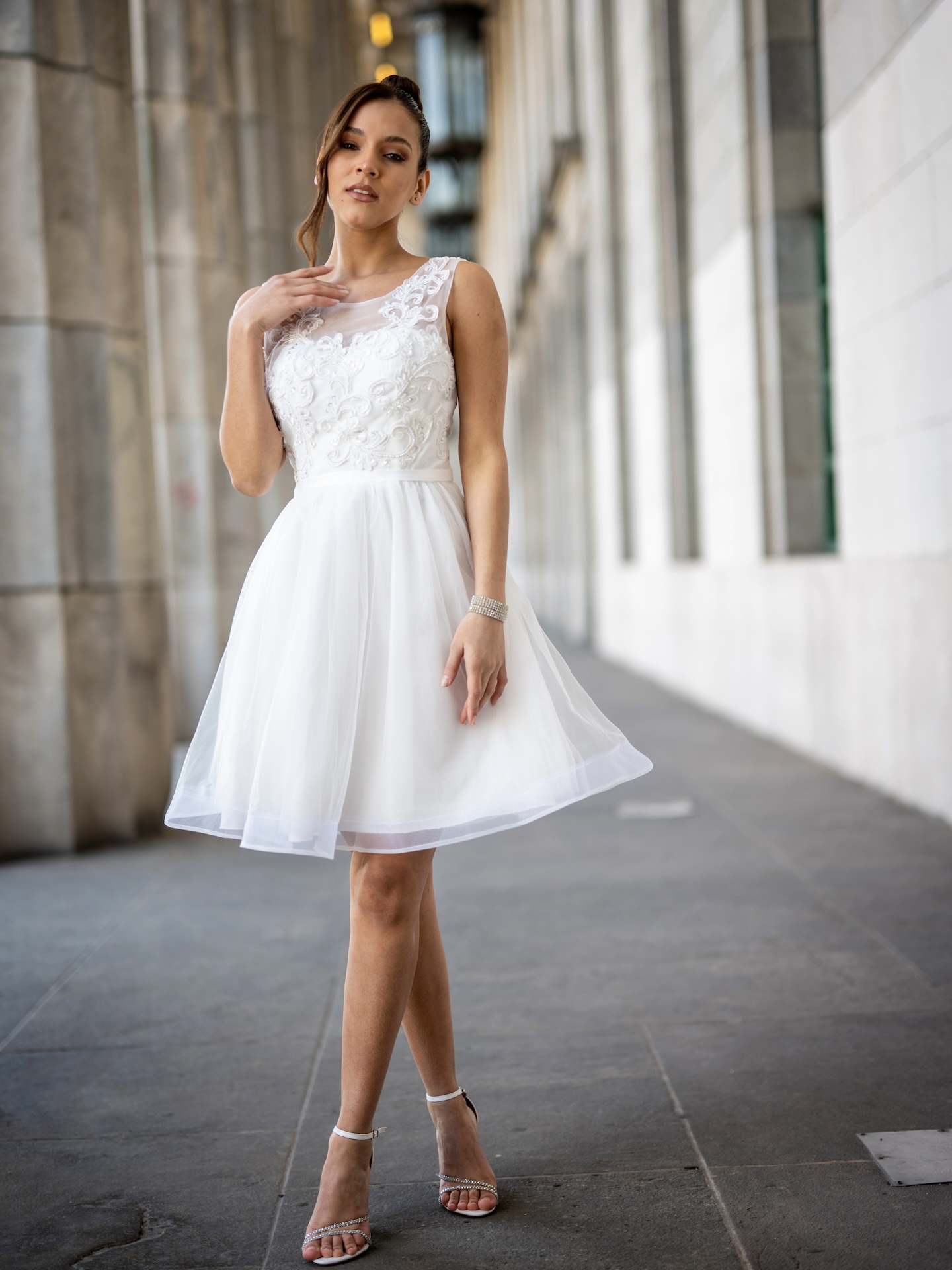Vestido sin mangas, evase a la rodilla de gasa y Tull bordado con detalle de cintura marcada con un lazo, transparencia superior con escote corazon con tazas que arman la zona del busto, espalda que se adapta a varios talles ya que tiene un sector de la misma con hilo elástico.