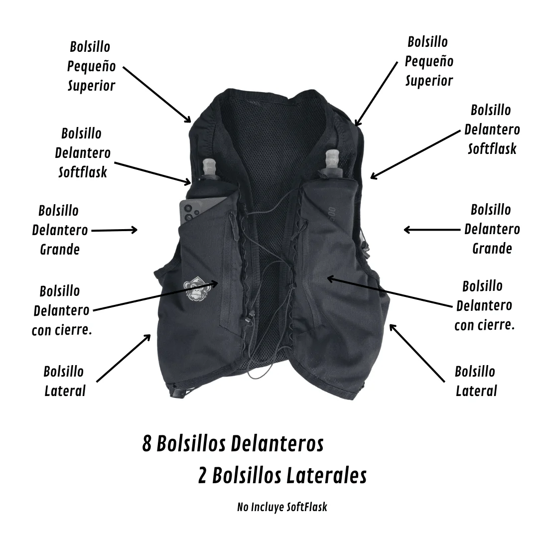Características Principales La mochila cuenta con 8 bolsillos delanteros estratégicamente ubicados para facilitar el acceso y la organización de tus pertenencias. Dos de estos bolsillos están diseñados específicamente para botellas softflask de 500 ml, lo que permite una hidratación rápida y conveniente. Además, incluye dos bolsillos delanteros grandes y dos bolsillos con cierre, ideales para guardar objetos de valor como el celular, la billetera y las llaves.
