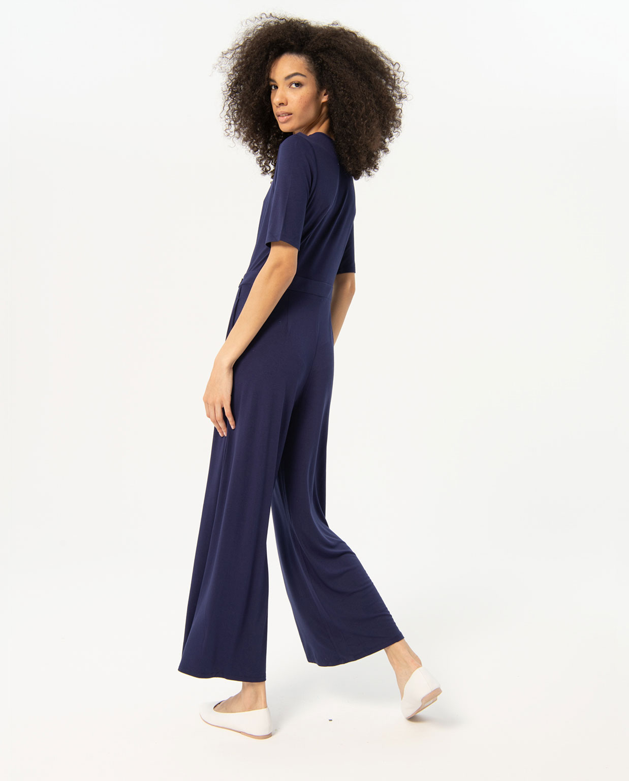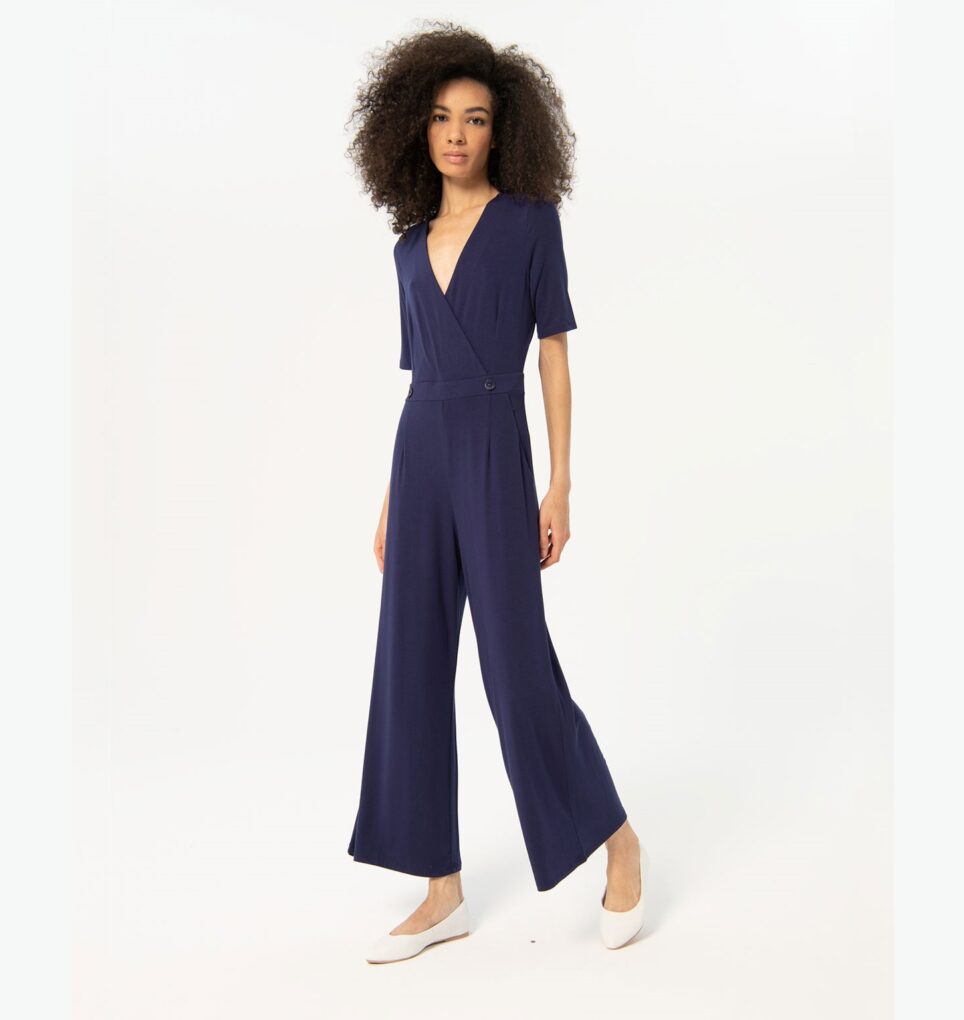 Mono largo en color azul marino , de manga corta y escote pico. Composición 95% viscosa y 5 % elastano.