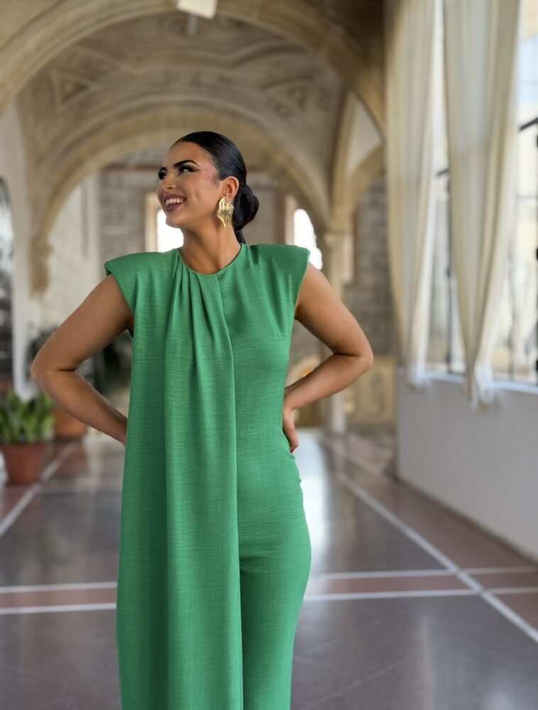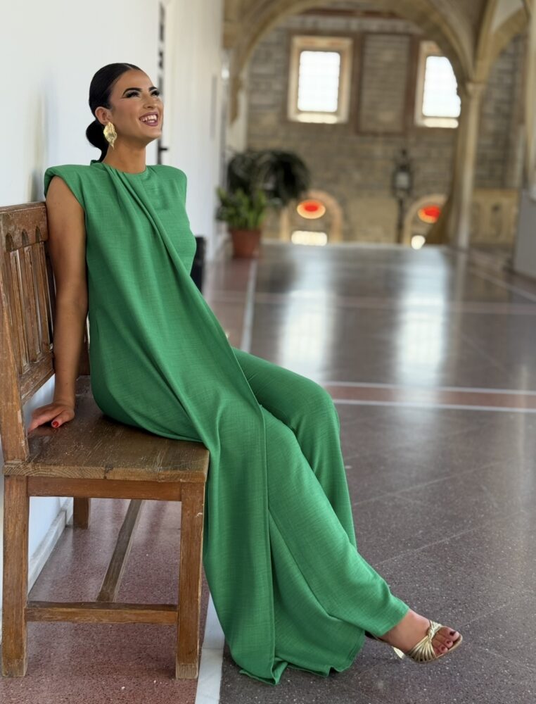 Mono en tejido lino sintético de color verde. El toque de distinción lo marca la zona frontal simulando una parte un vestido y la otra un mono. La espalda es abierta y muy protagonista.