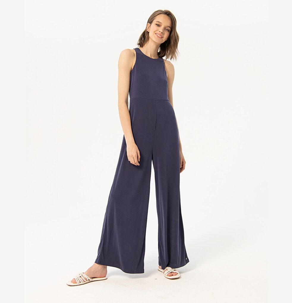 Mono largo azul marino, de tirantes y cuello redondo. Este mono tiene un tejido elástico y muy cómodo. composición 70% Modal y 30% Poliéster.