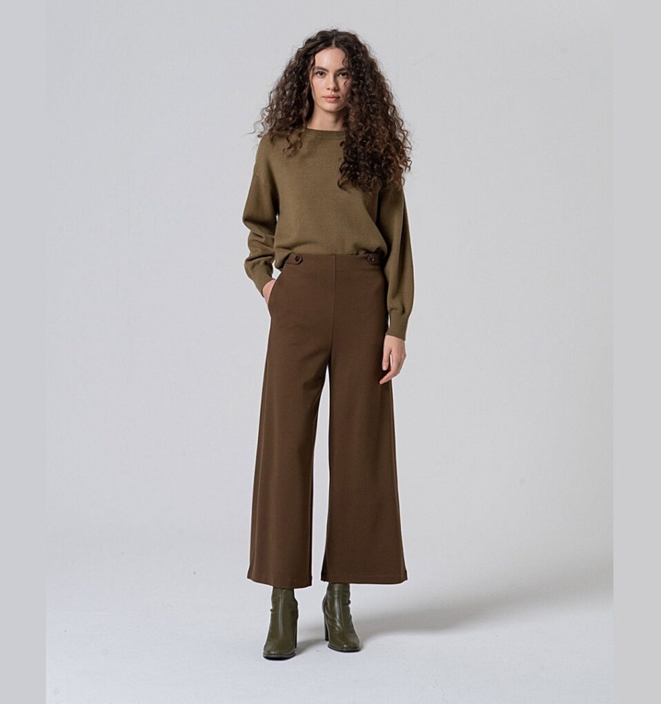 Pantalón de pernera ancha, ligeramente acampanada, en color caqui oscuro. Con bolsillos laterales, sin cierre, con goma y dos botones decorativos en la cintura. Composición 56% rayón, 37% nylon y 7% spandex.
