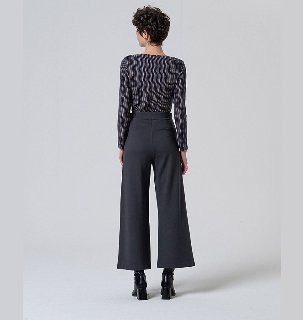 Pantalón de pernera ancha, ligeramente acampanada, en color gris oscuro. Con bolsillos laterales, sin cierre, con goma y dos botones decorativos en la cintura. Composición 56% rayón, 37% nylon y 7% spandex.