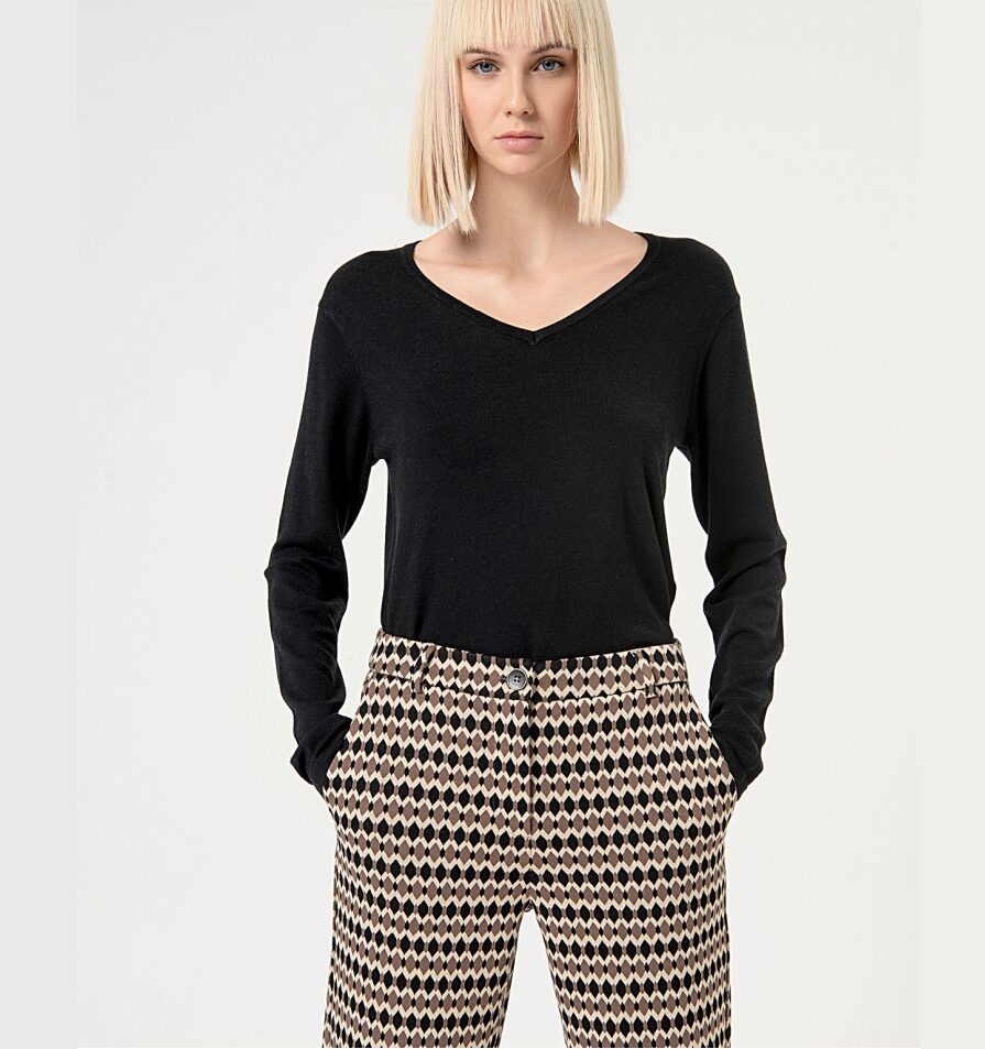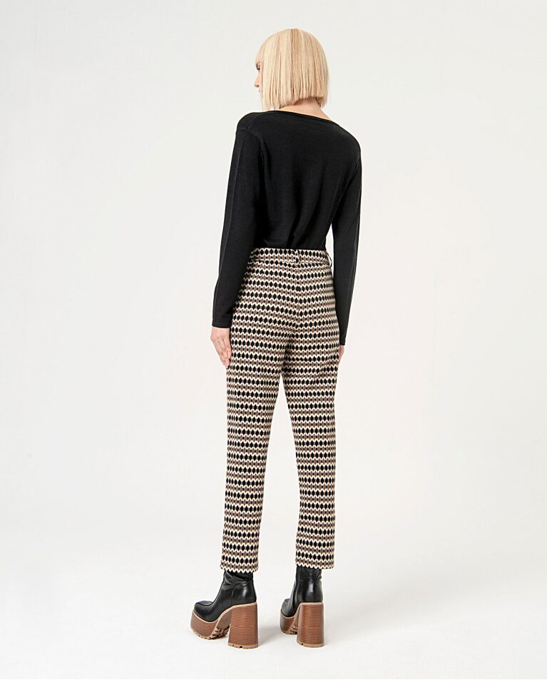 Pantalón de punto grueso, largo, recto y ajustado en la parte inferior de la pierna. Con bolsillos laterales, cierre de cremallera y botón. Estampado en marrón y negro, de tejido elástico. Composición 50% poliéster, 30% viscosa, 15% nylon y 5% elastano.
