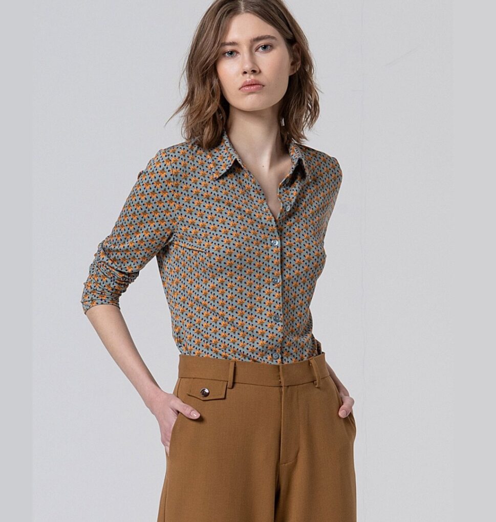 Pantalón largo de corte recto, cierre de botón y cremallera, con bolsillos laterales y traseros. En color camel. Su composición es 66% poliéster, 24% viscosa, 5% lana y 5% elastano.