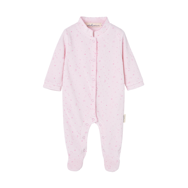 Pelele rosa de manga larga con puño y cierre frontal y en el bajo. Con estampado de constelaciones.