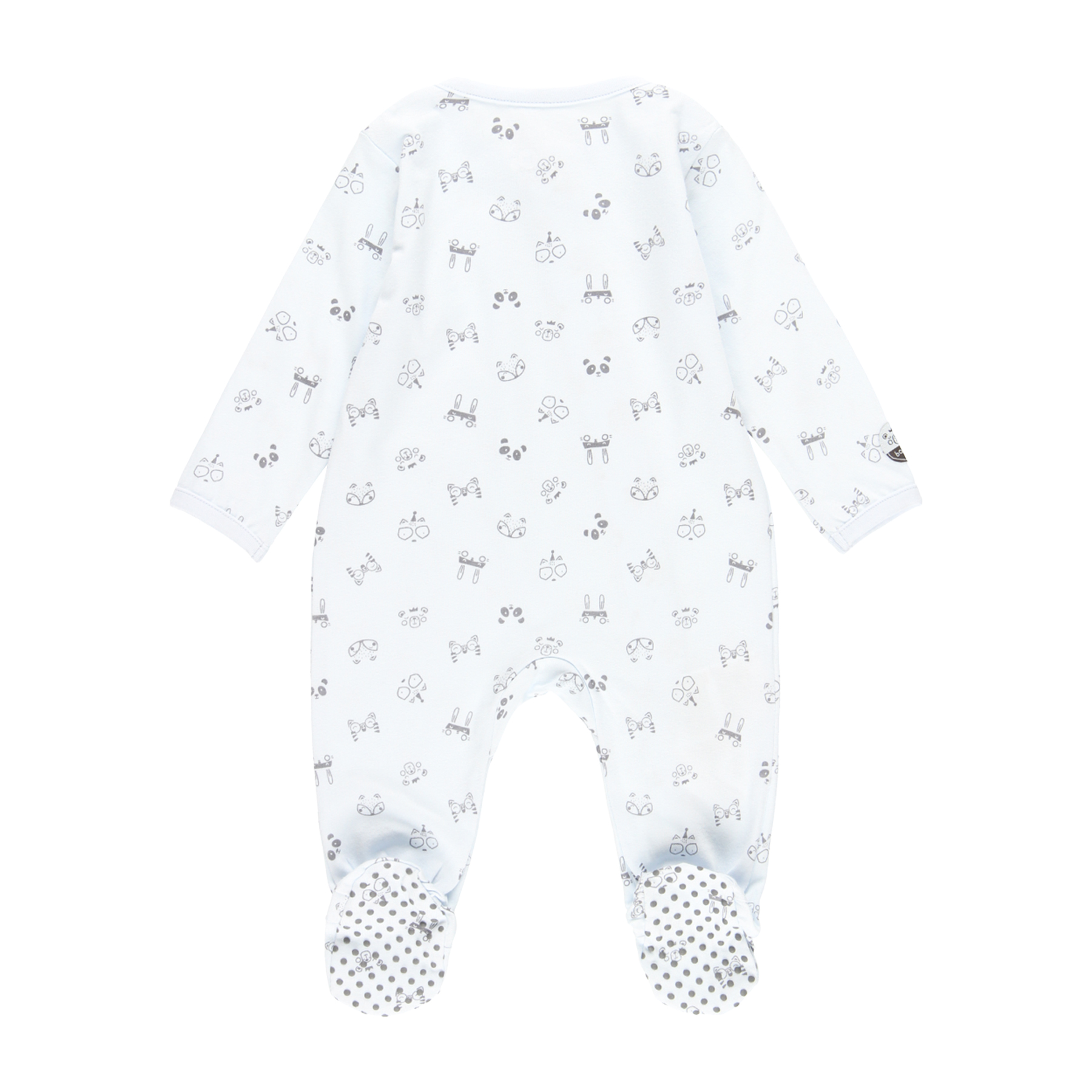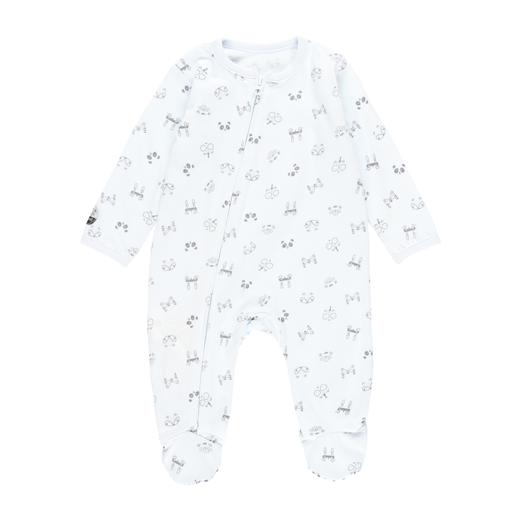 Pelele de punto liso para bebé. Es de color celeste con un estampado en color gris oscuro. Se cierra con cremallera y tiene topos antideslizantes en la parte de la planta del pie.