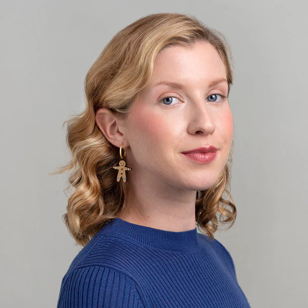 Pendientes de aro hechos en metal dorado antialérgico, con colgante de madera con forma de galleta de jengibre. Medidas del pendiente 33 x 25mm.