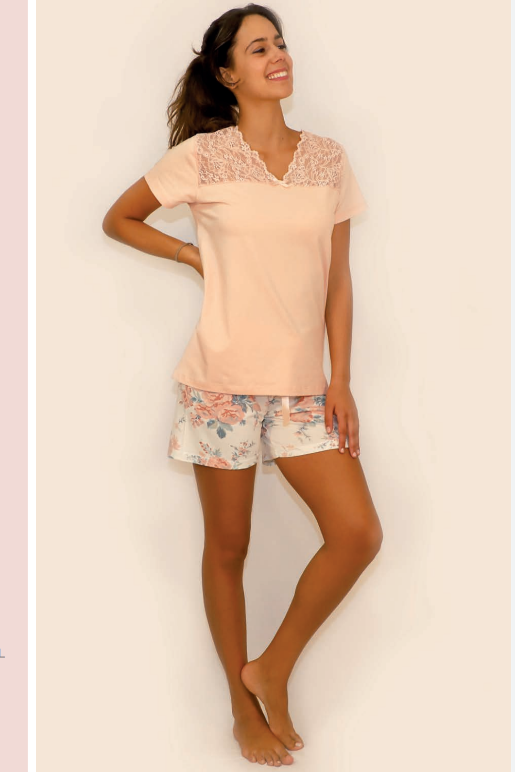 Pijama de mujer compuesto por camiseta de manga corta con encaje en la parte superior y pantalón corto con estampado de flores.