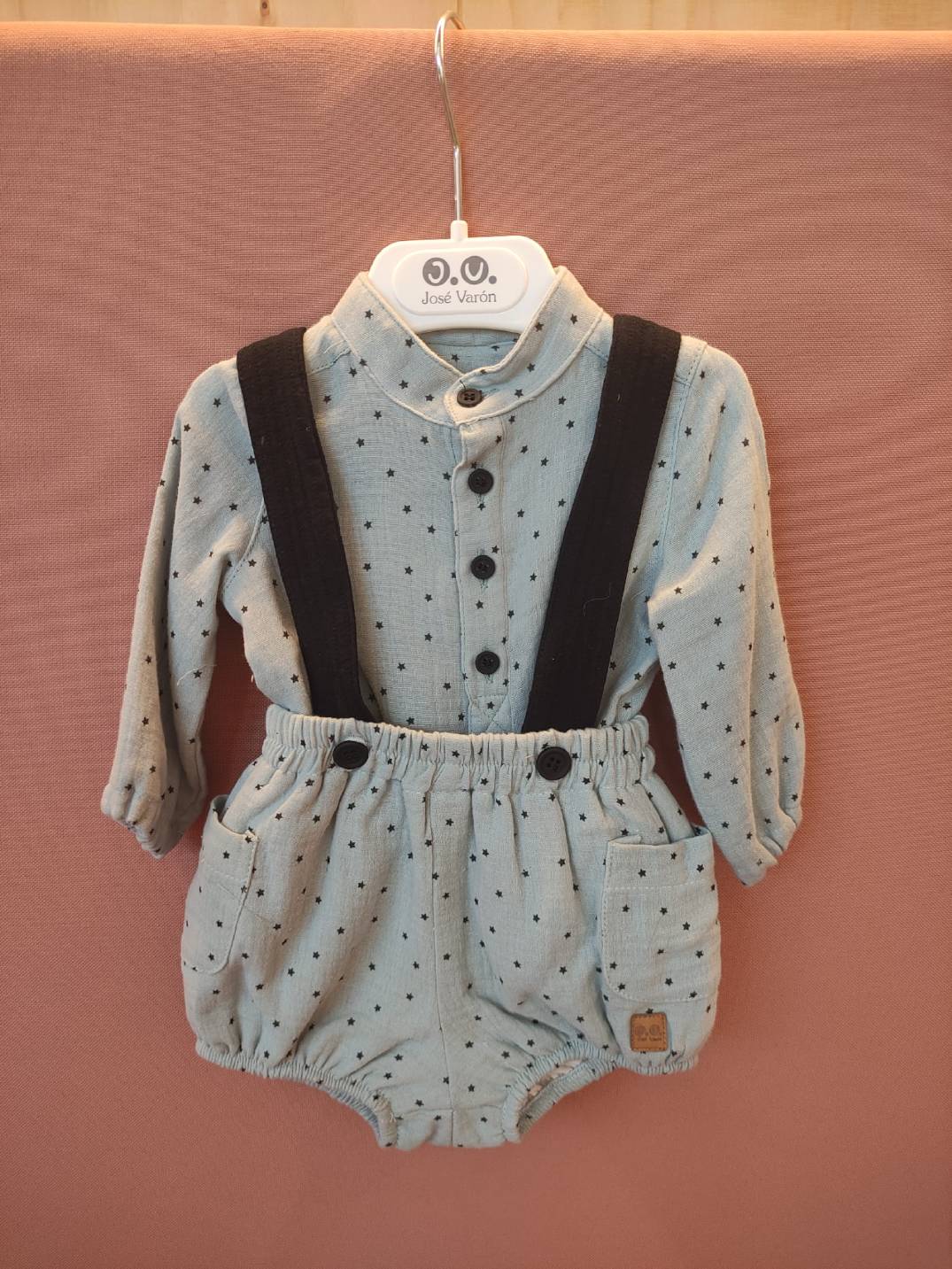 Conjunto de ranita con tirantes extraíbles y camisa a juego. Color azul estrellas en negro.