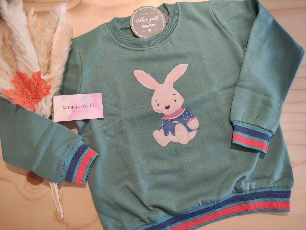 Sudadera niña color verde agua con dibujo de conejo. Cuello redondo