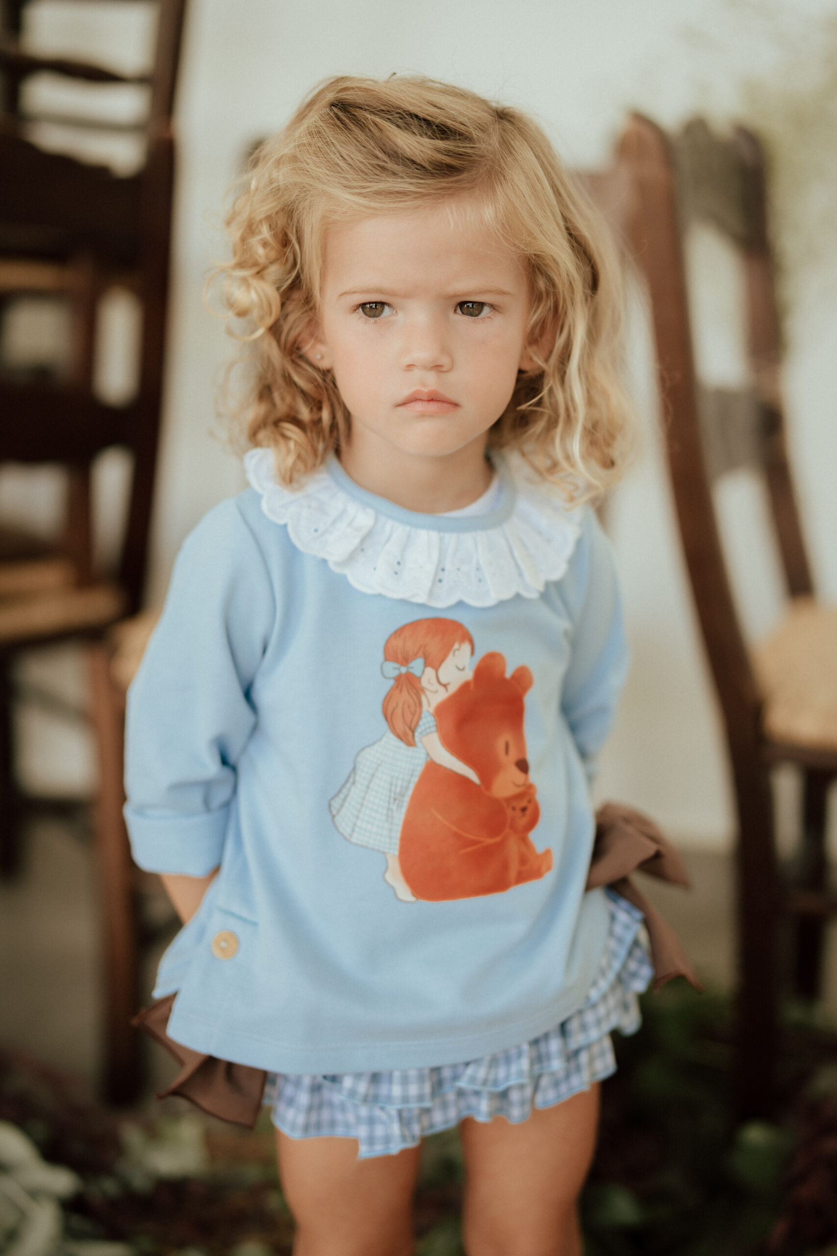 Sudadera de Pio Pio, color azul celeste con cuello blanco y dibujo frontal de niña y ositos.