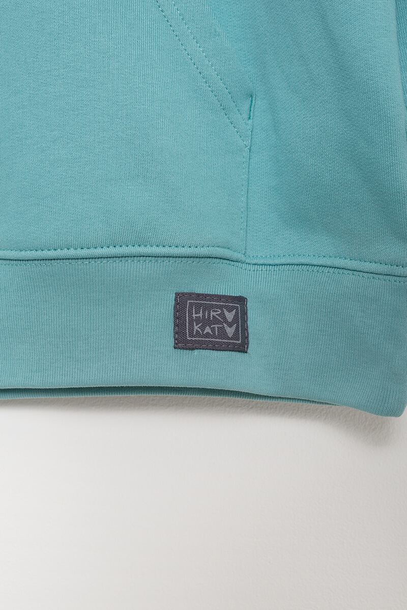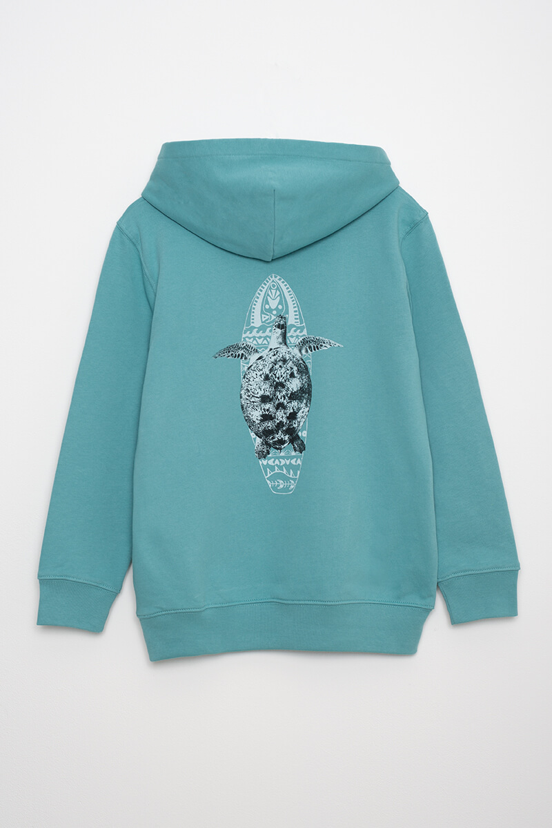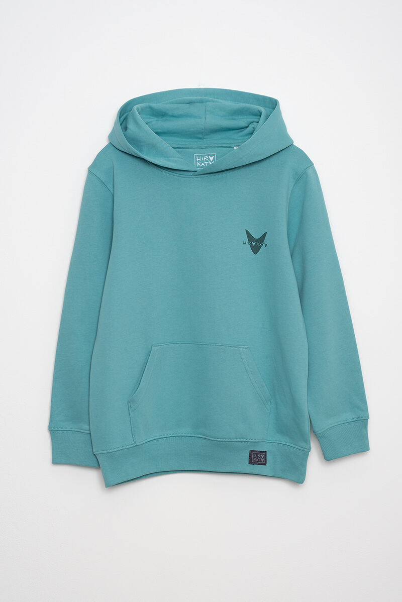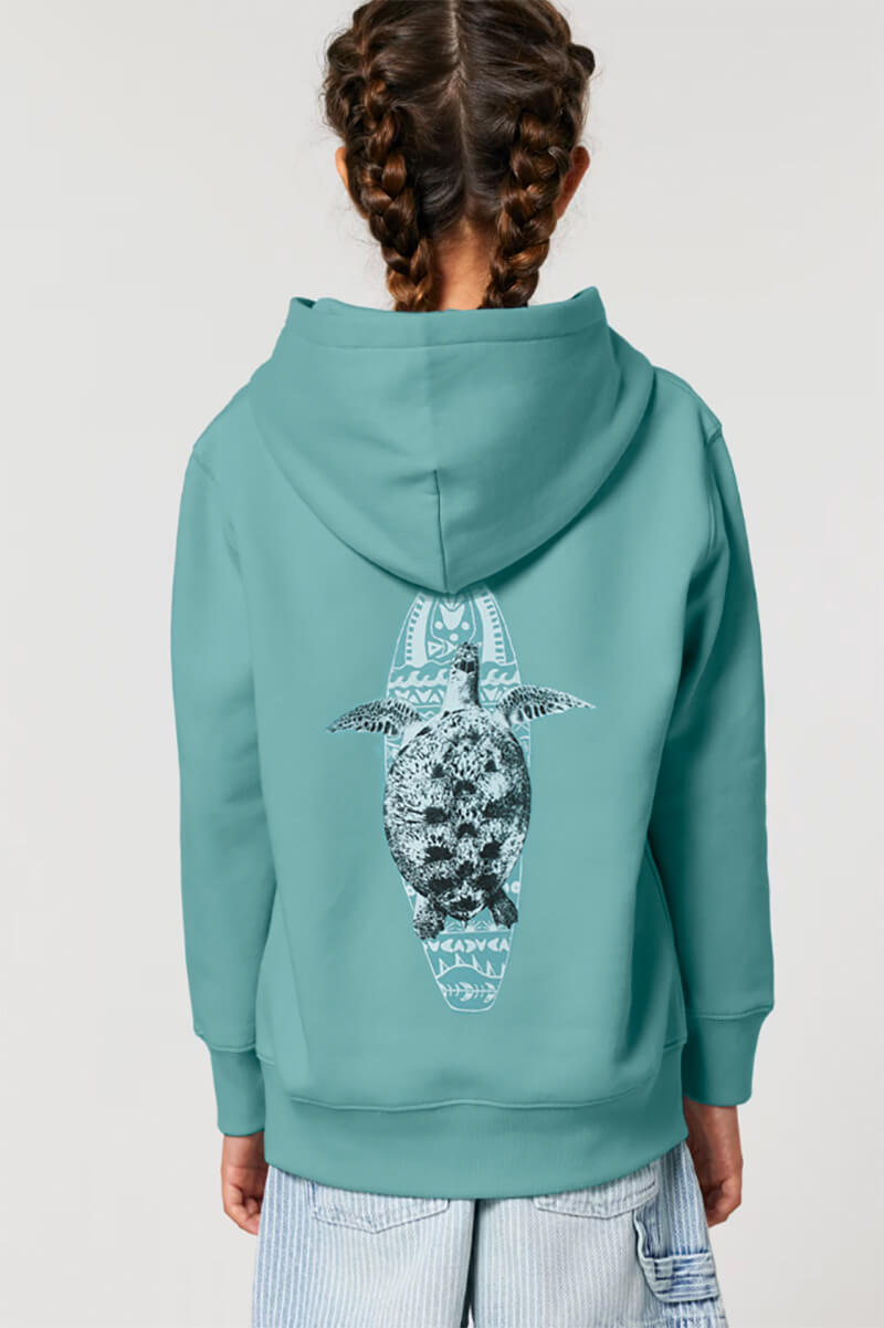 Sudadera niñ@ verde con capucha 100% algodón orgánico. Realizada de forma sostenible y vegana, con diversos certificados que acreditan su producción respetuosa con el medio ambiente y los trabajadores.