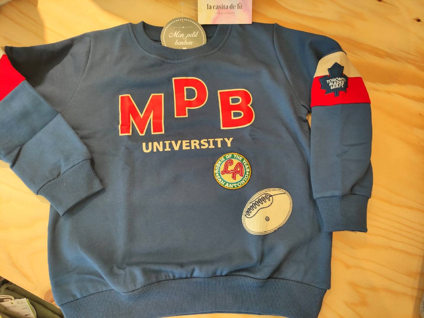 Sudadera de felpa, con cuello redondo. Color azul con letras en rojo. University