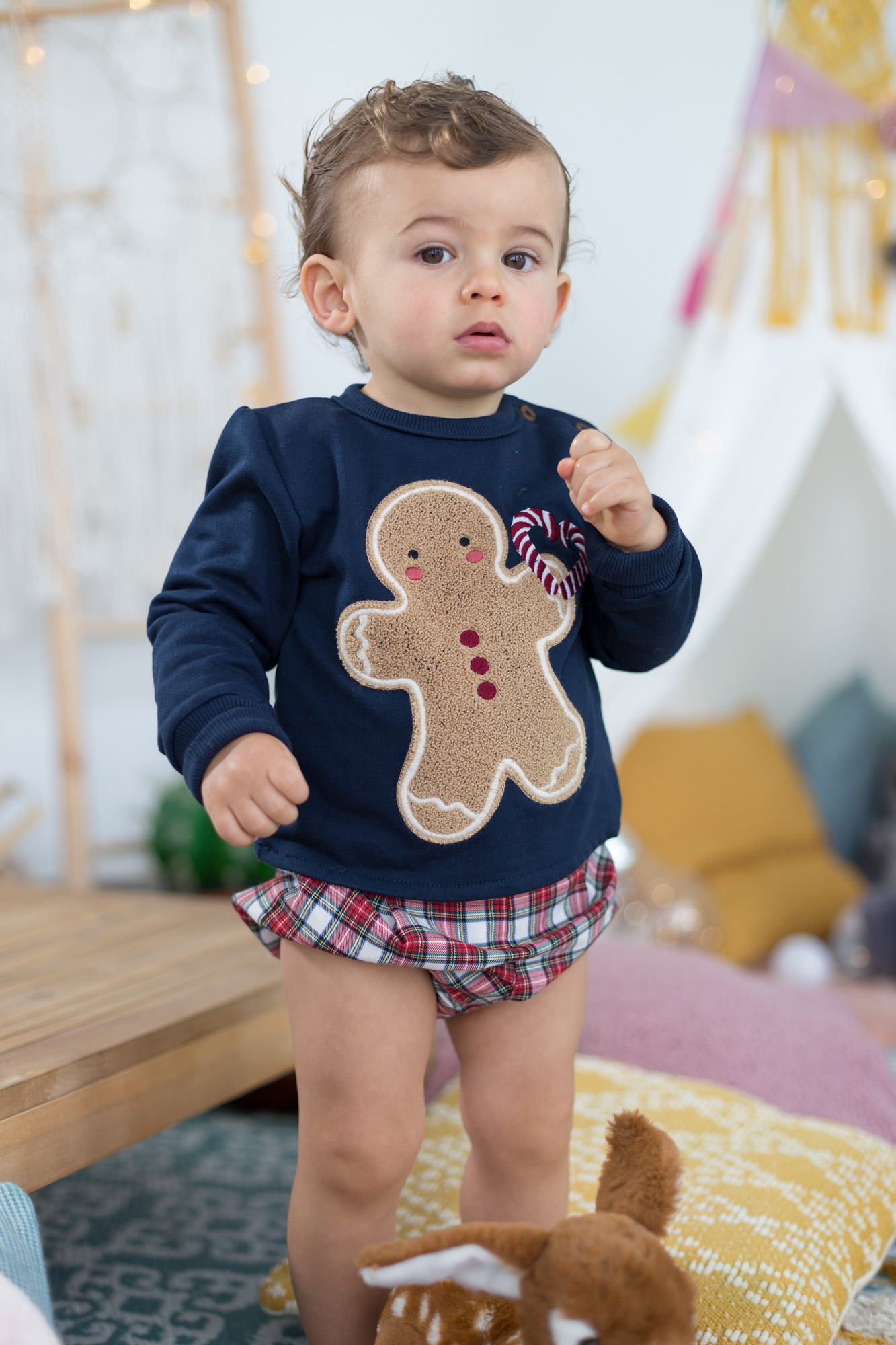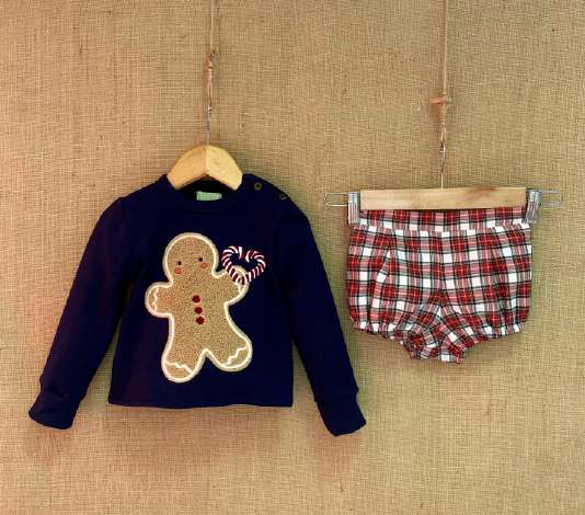 Conjunto de niño formado por sudadera con motivos navideños y pantalón de cuadros a juego.