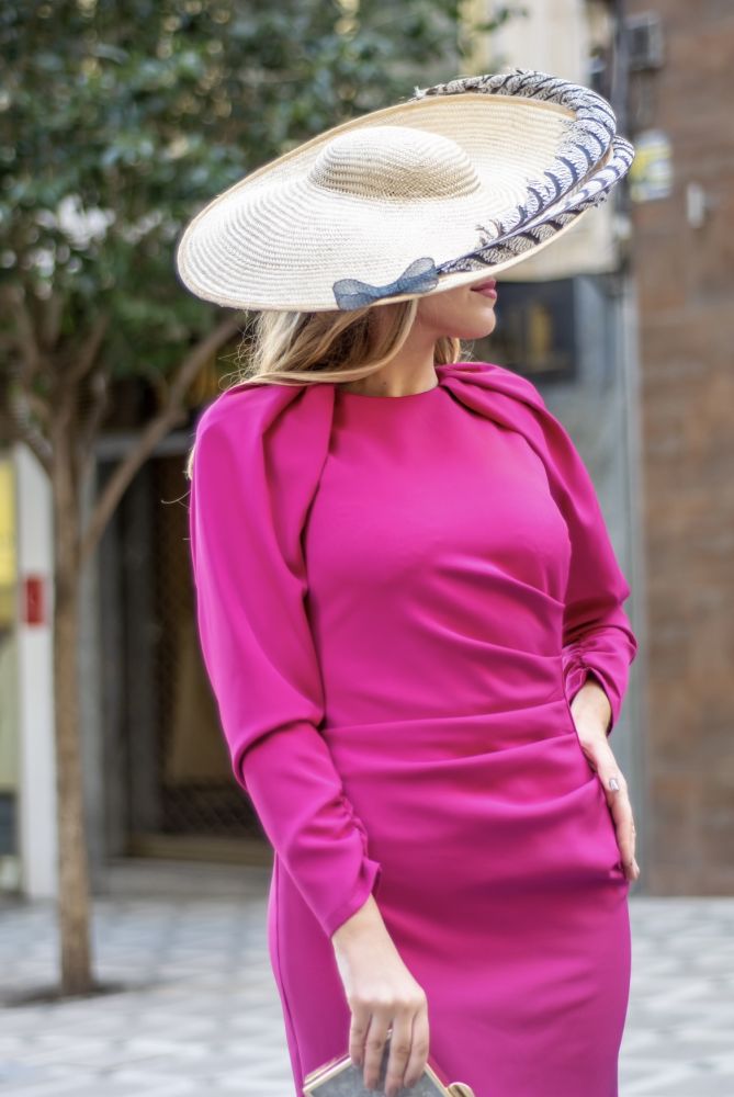 Tocado en rafia con varias plumas de faisán bordeando el frontal de la misma. Se ancla al pelo con una diadema.