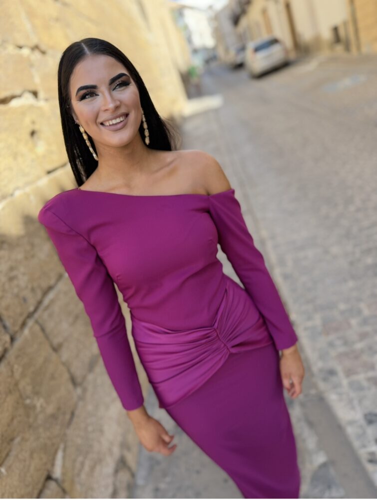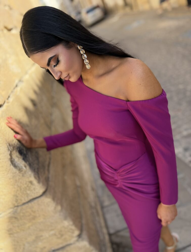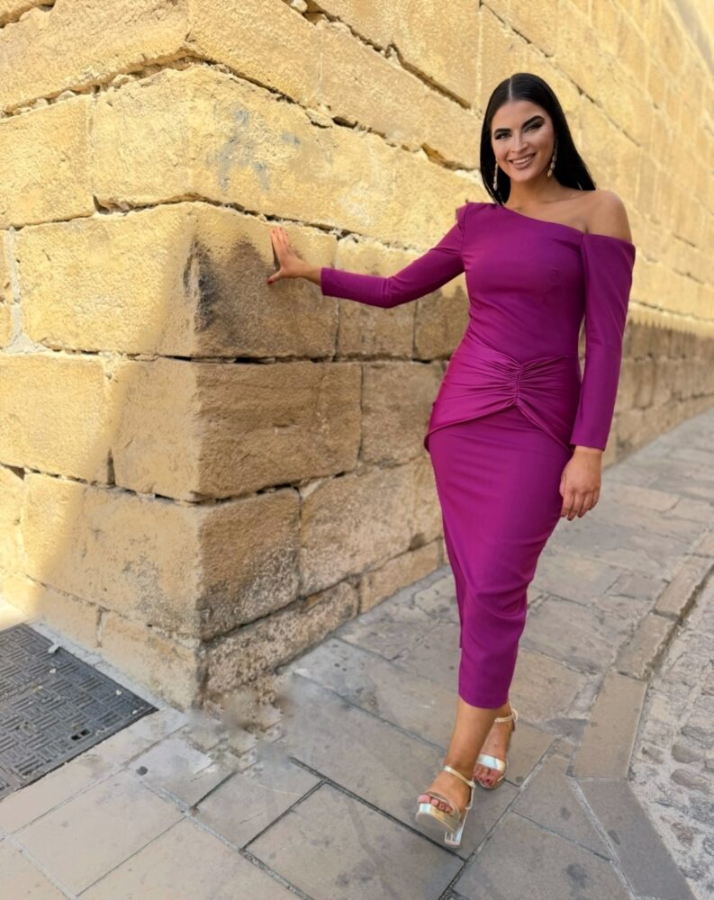 Vestido midi en tejido crepe de color buganvilla forrado al tono. El toque de distinción lo marca la asimetría de la manga, el drapeado en gasa de la zona frontal y la raja trasera. Un vestido muy femenino para arrasar como invitada perfecta.