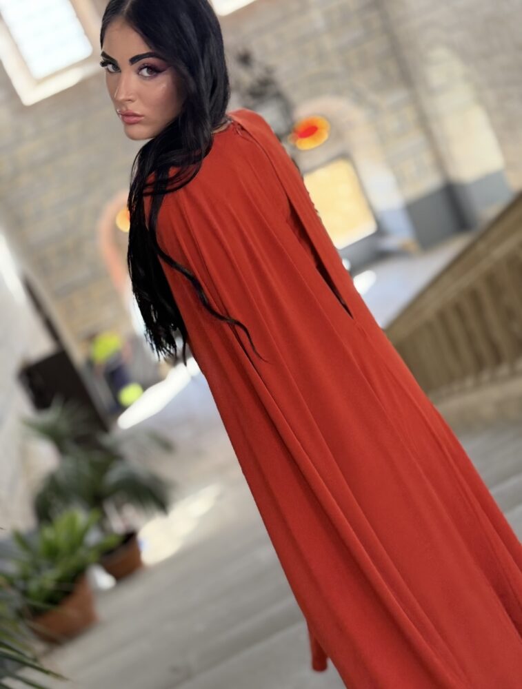 Vestido midi en tejido punto de seda forrado al tono el color caldera. El toque de distinción lo marca la capa trasera (no se puede desmontar), los drapeados por todo el cuerpo y el anudado frontal tan elegante. Es un vestido espectacular para arrasar como invitada perfecta.